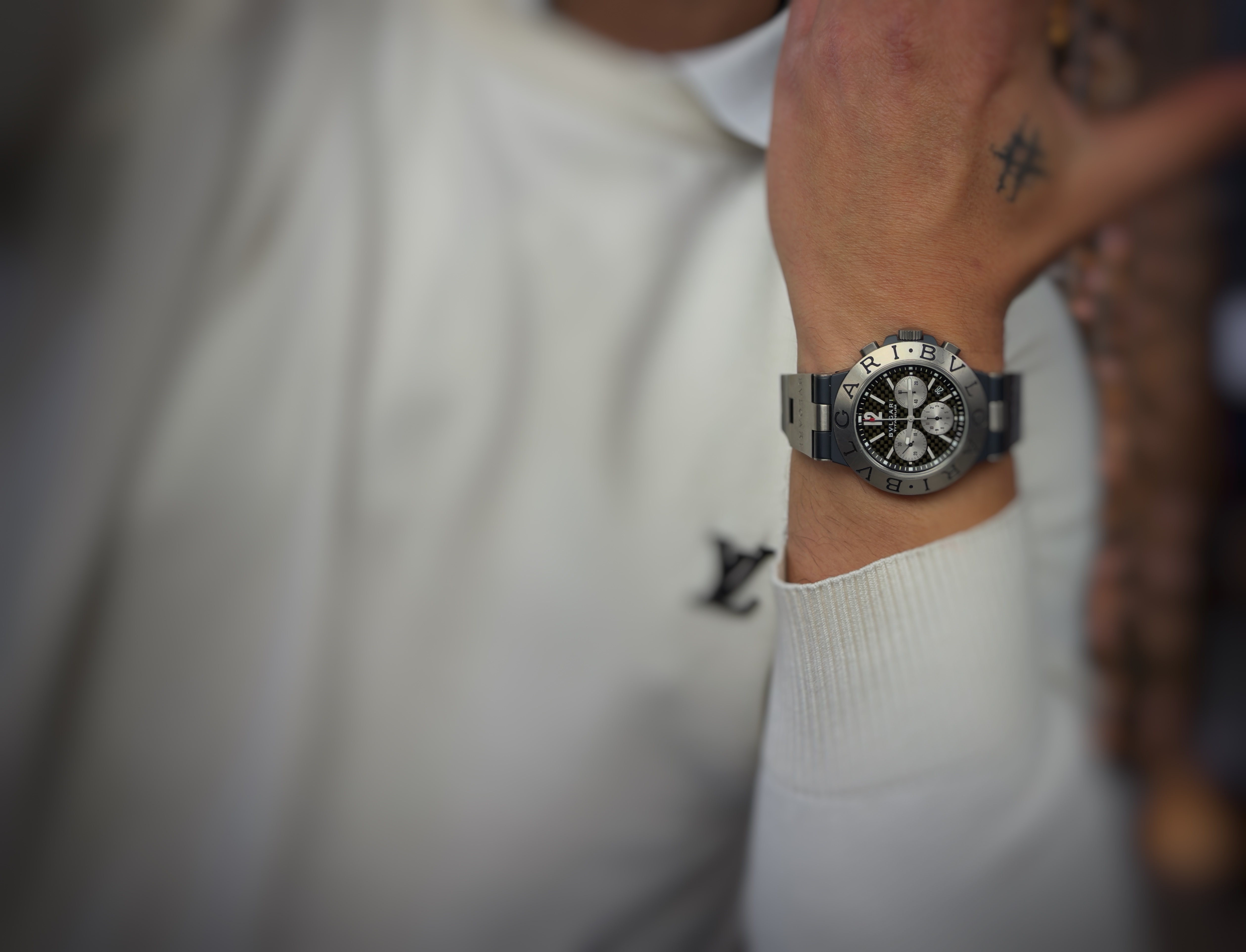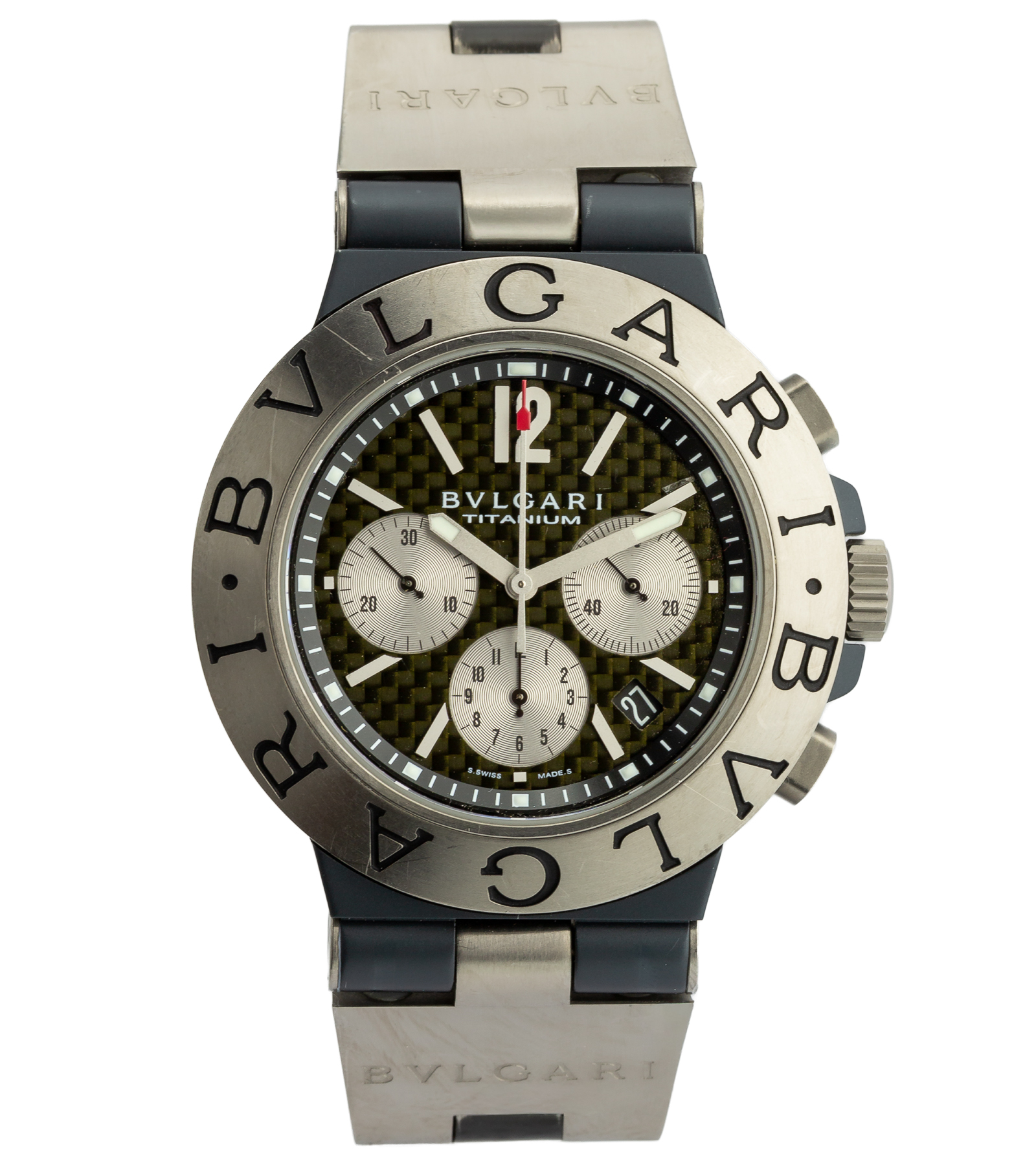 Used original watch, very good condition. Bulgari Diagono is a sporty chronograph with a distinctive Italian design that combines luxurious aesthetics with the technical nature of tool watches. The model is distinguished by its lightweight titanium construction and modern “carbon” dial styling, giving it a dynamic and futuristic look. It is an option for those looking for a watch with a definite character – sporty, but at the same time elegant and recognizable thanks to its distinctive barrel with “BVLGARI BVLGARI” engraving.