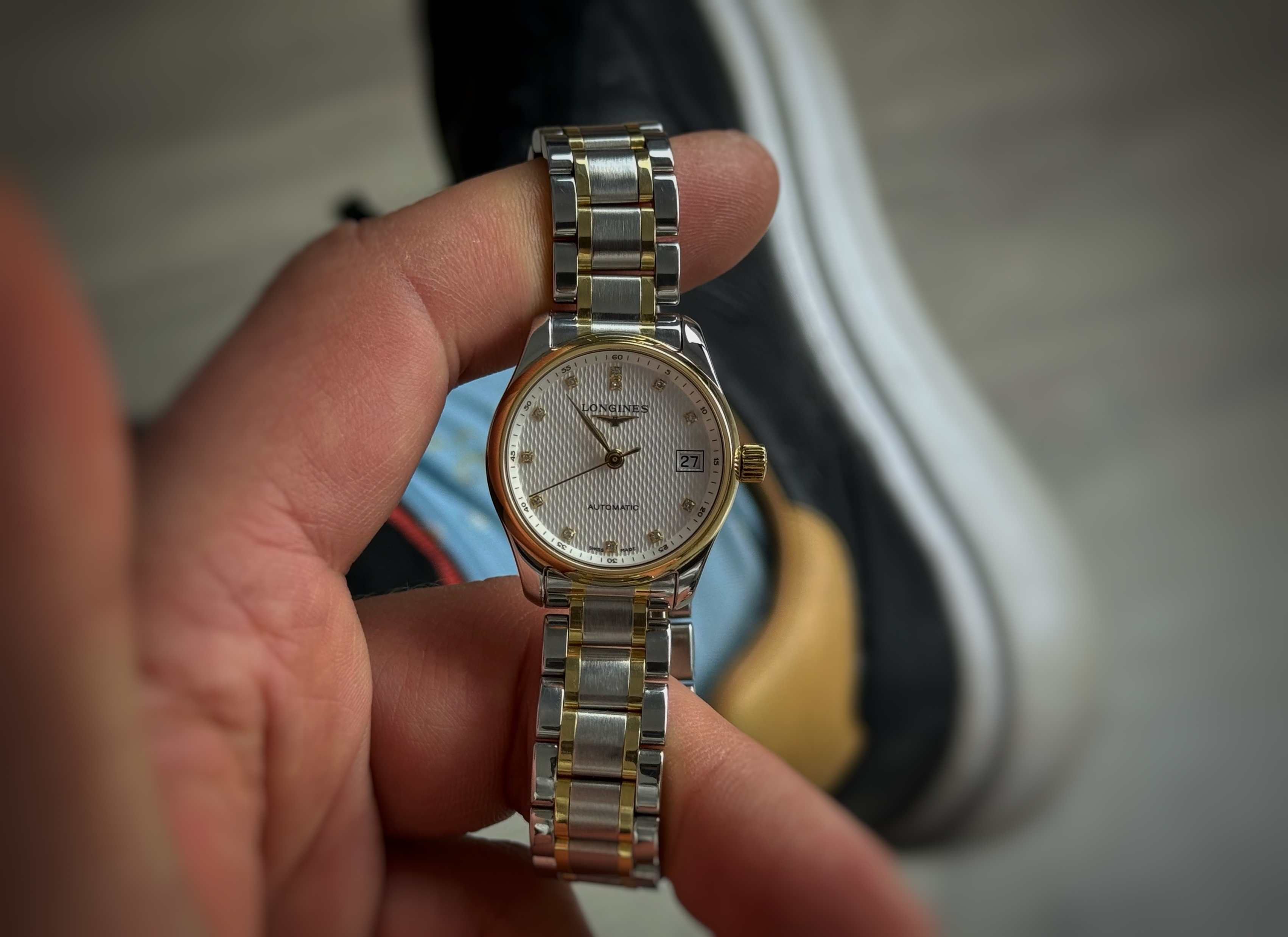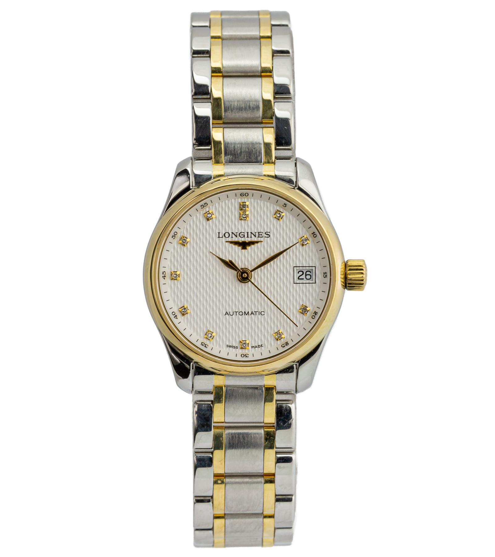 Original ladies’ used watch, very good condition. The Longines Master Collection has been the essence of classic watchmaking by the Swiss manufactory for many years. The given model is an elegant ladies’ timepiece, which combines timeless style with the precision of the automatic mechanism. The watch impresses with a harmonious combination of stainless steel and 18K gold, which gives it an extremely luxurious character. The silver dial is decorated with the collection’s characteristic guilloche “barleycorn” pattern, which beautifully reflects the light and emphasizes the elegance of the watch.
