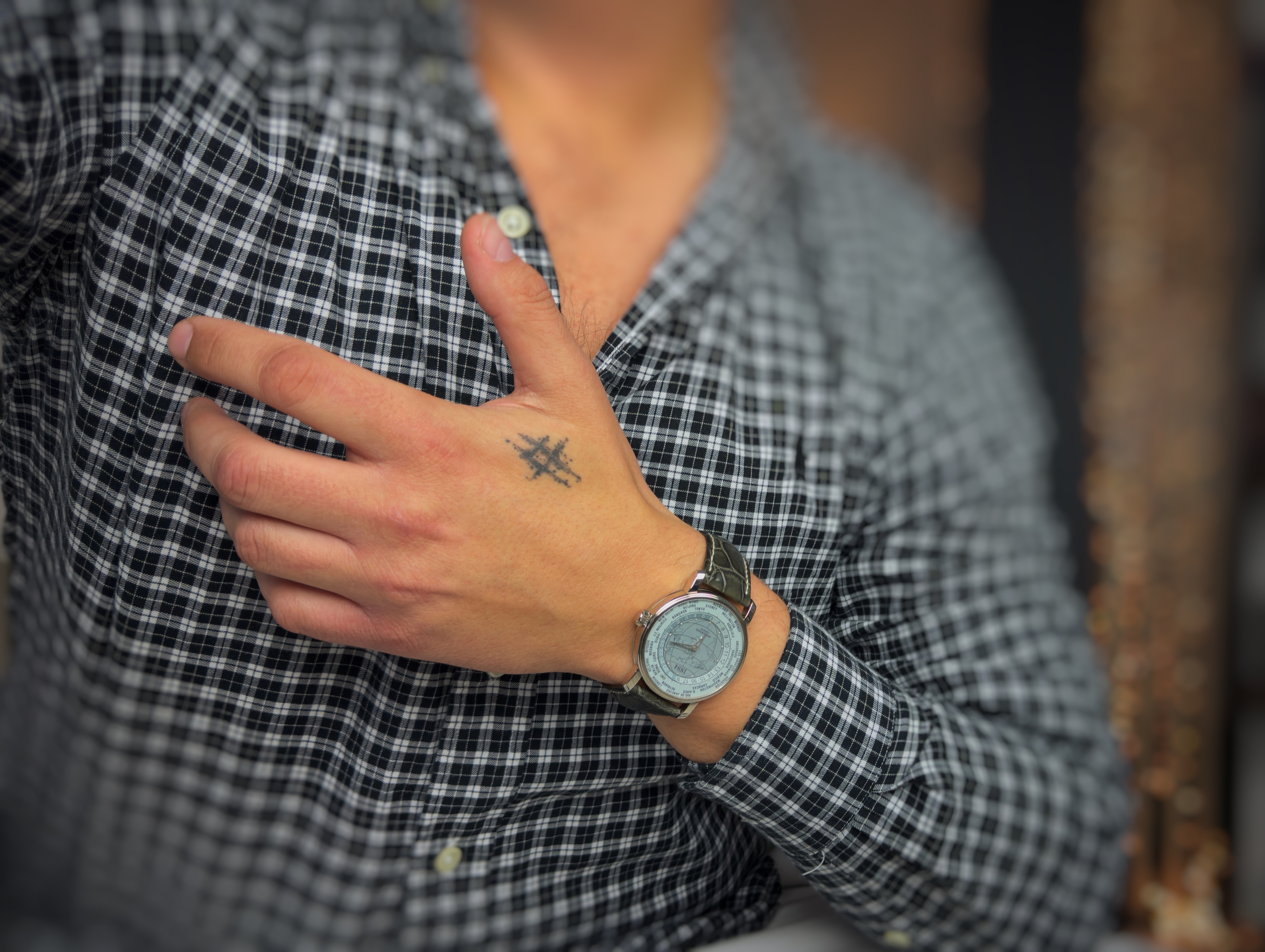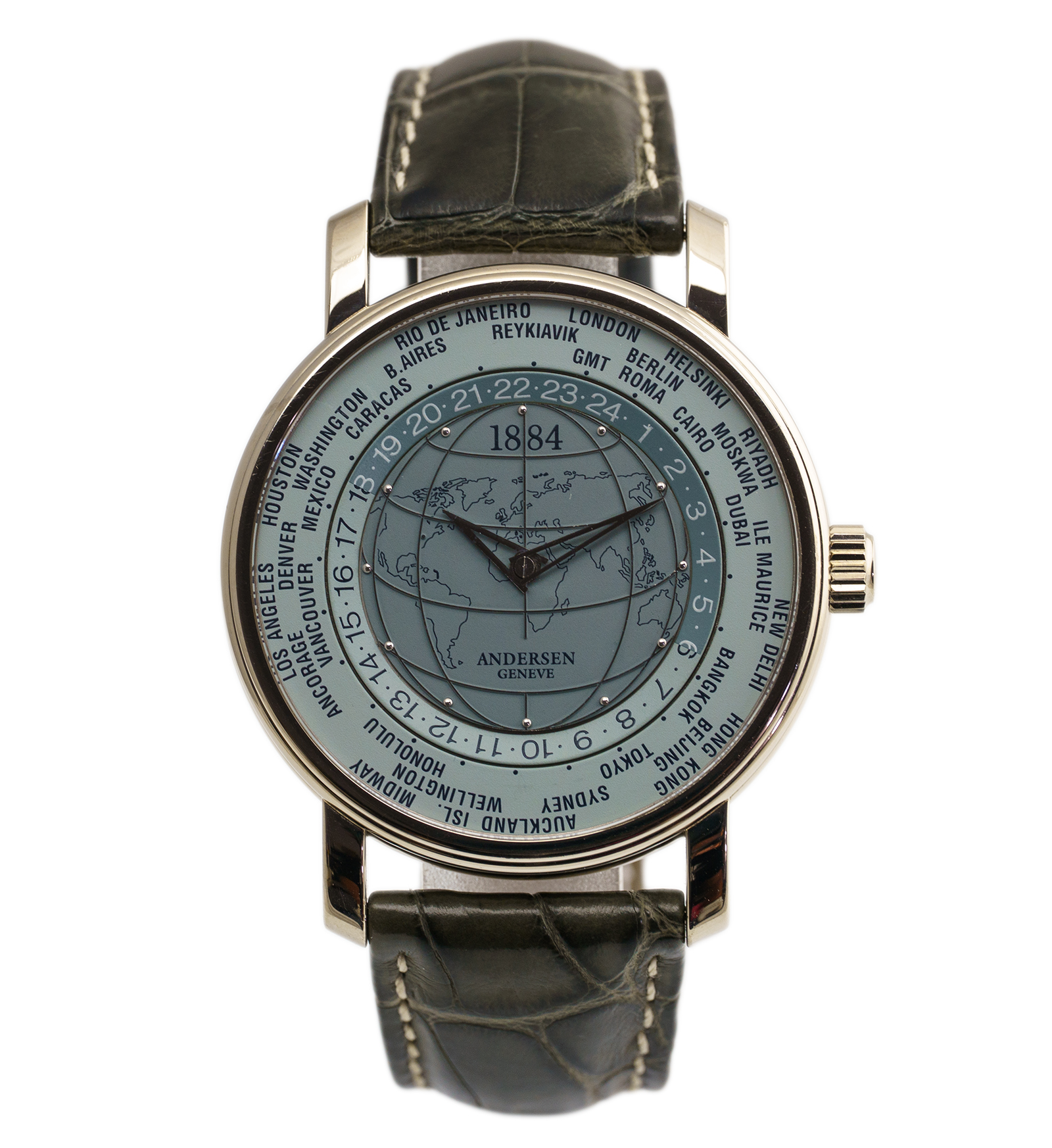 Oryginalny zegarek męski, używany ale zachowany w bardzo dobrym stanie. Niezwykle unikatowy egzemplarz, wykonany tylko w jednej wersji przez samego Svend Andersen-a. (H- Serie) Model z limitowanej edycji, upamiętniającym 120. rocznicę wprowadzenia systemu 24 stref czasowych, zapoczątkowanego przez szkocko-kanadyjskiego inżyniera kolejowego i wynalazcę Sandforda Flemminga, który powstał z jego inicjatywy w 1884 roku, Svend Andersen