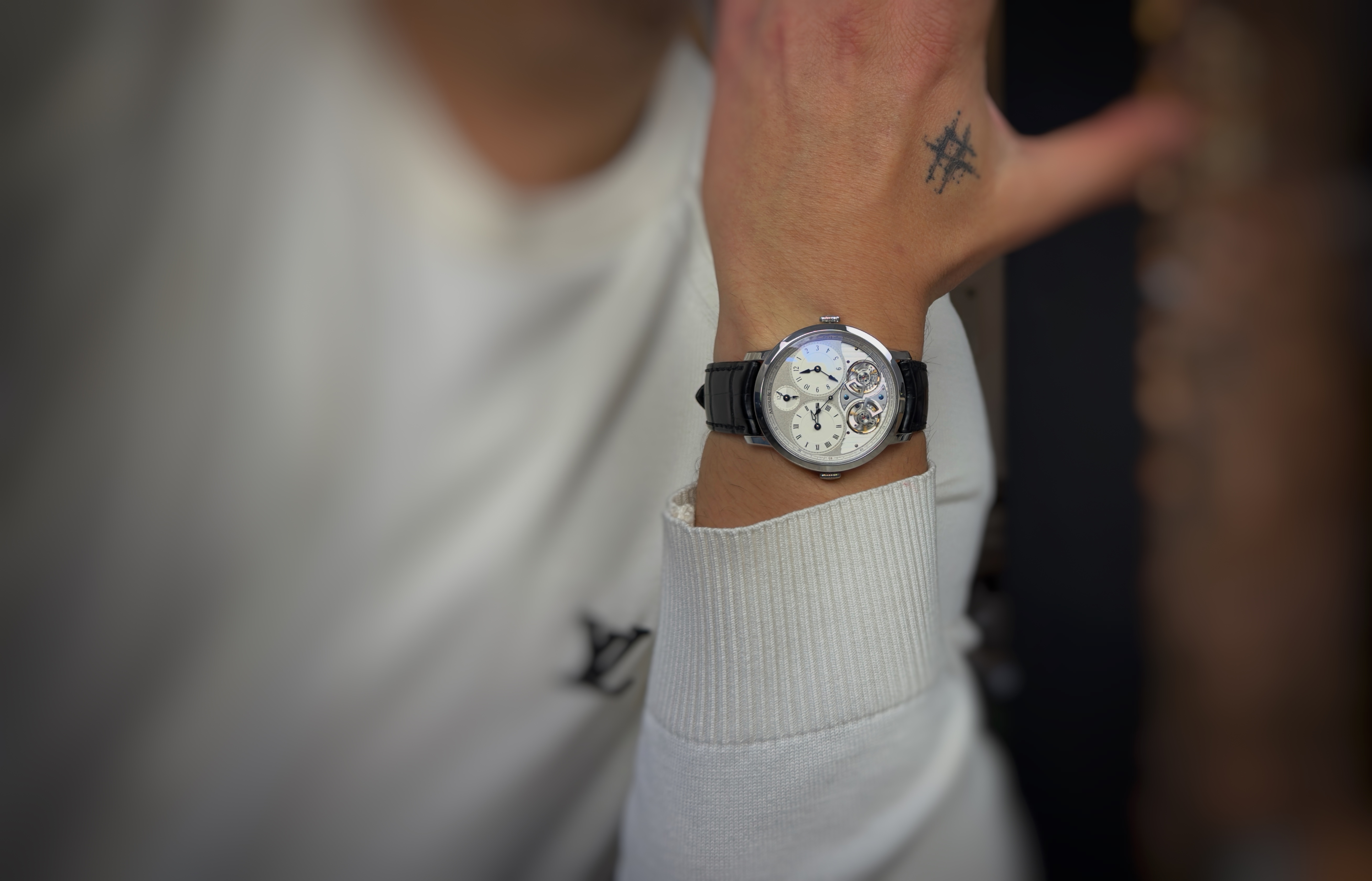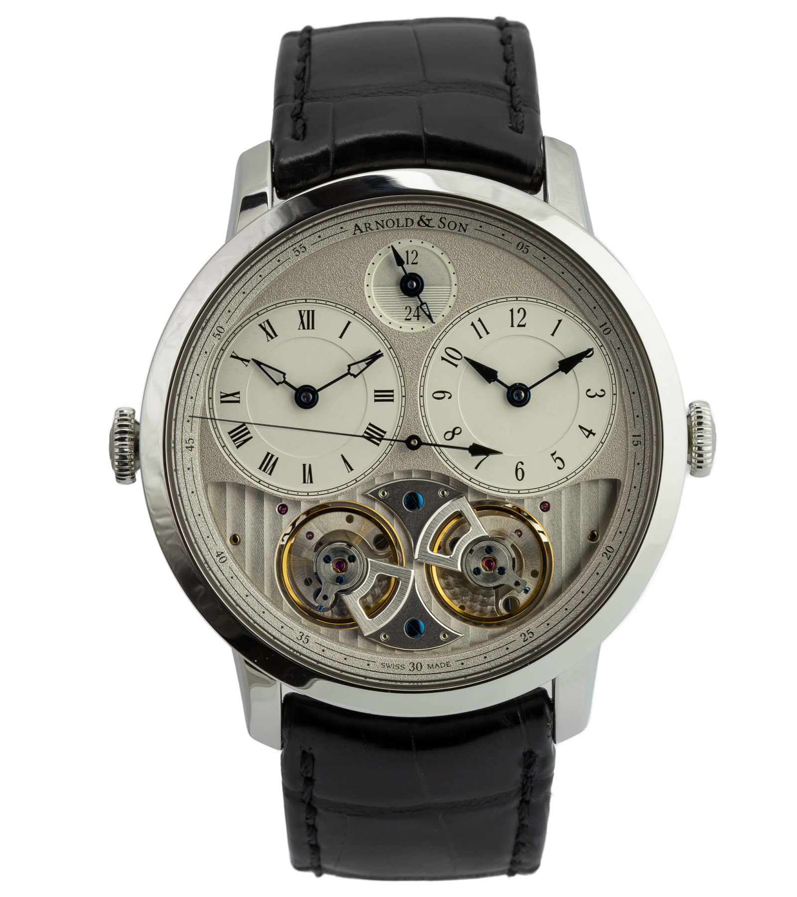 Oryginalny używany zegarek stan bardzo dobry. Arnold & Son DBG Equation GMT to wyjątkowy przykład haute horlogerie, który łączy zaawansowaną komplikację dwóch stref czasowych z niezwykle symetrycznym i technicznym designem. Model ten wyróżnia się unikalną konstrukcją „Dual Balance GMT” – oferującą dwa niezależne mechanizmy regulujące czas dla dwóch stref.