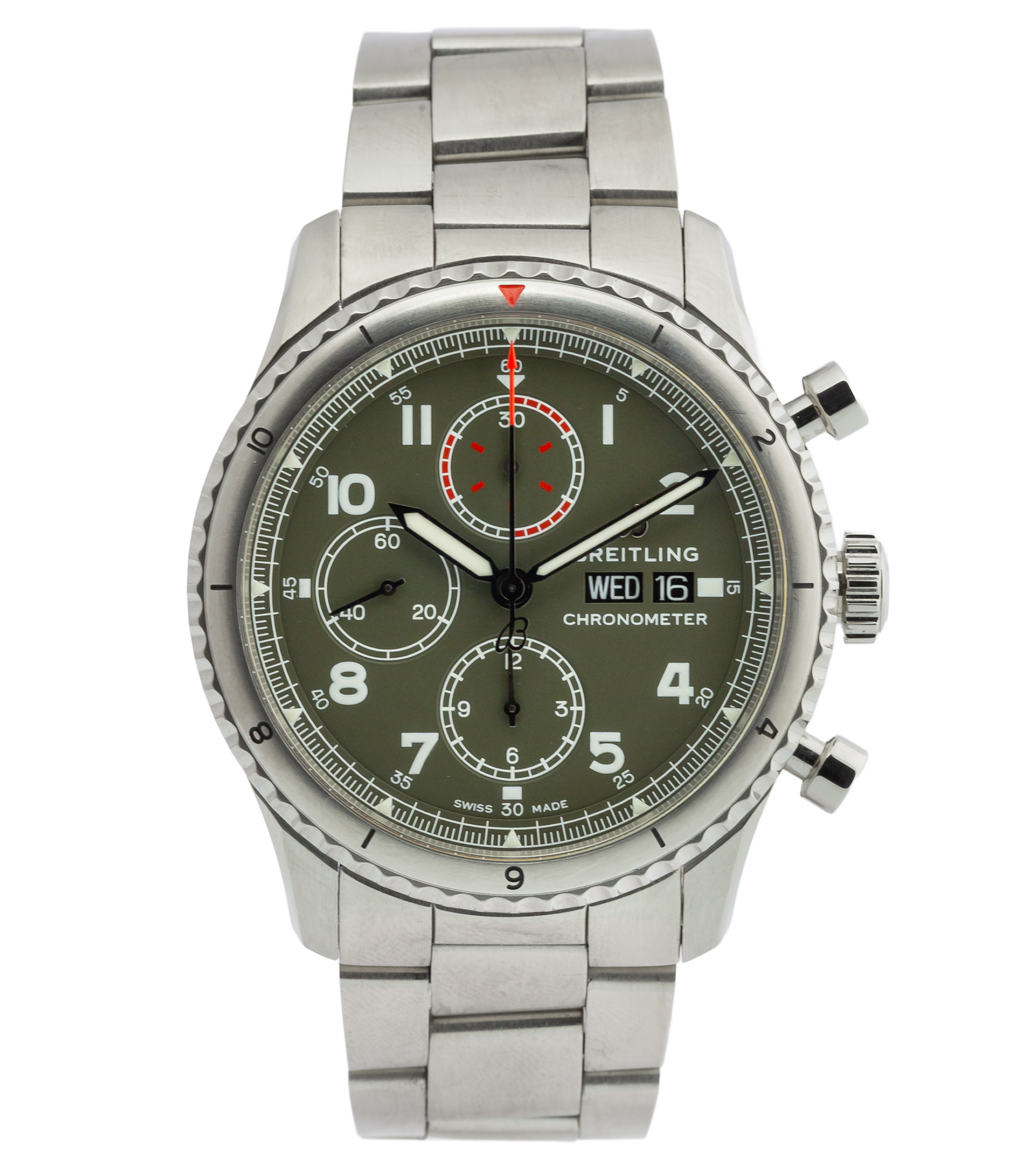 Oryginalny używany zegarek, zachowany w bardzo dobrym stanie. Model Breitling Aviator 8 Curtiss Warhawk to wyjątkowy pilotowy chronograf z kolekcji Aviator inspirowany dziedzictwem lotniczym i legendarnym samolotem Curtiss P-40 Warhawk. Zegarek łączy klasyczny styl pilotów z nowoczesnym wykonaniem, tworząc czasomierz, który jest jednocześnie narzędziem i ikoną designu