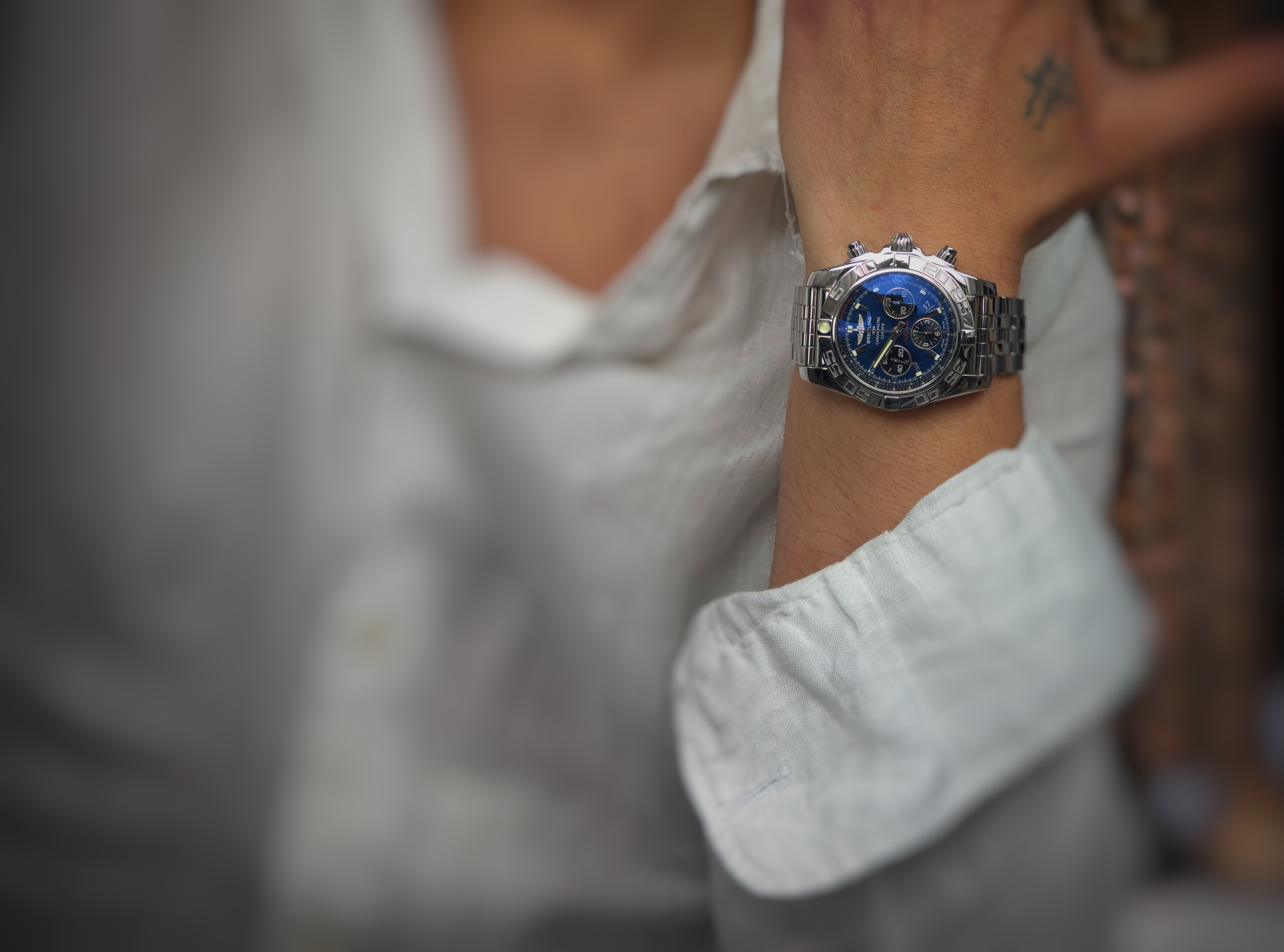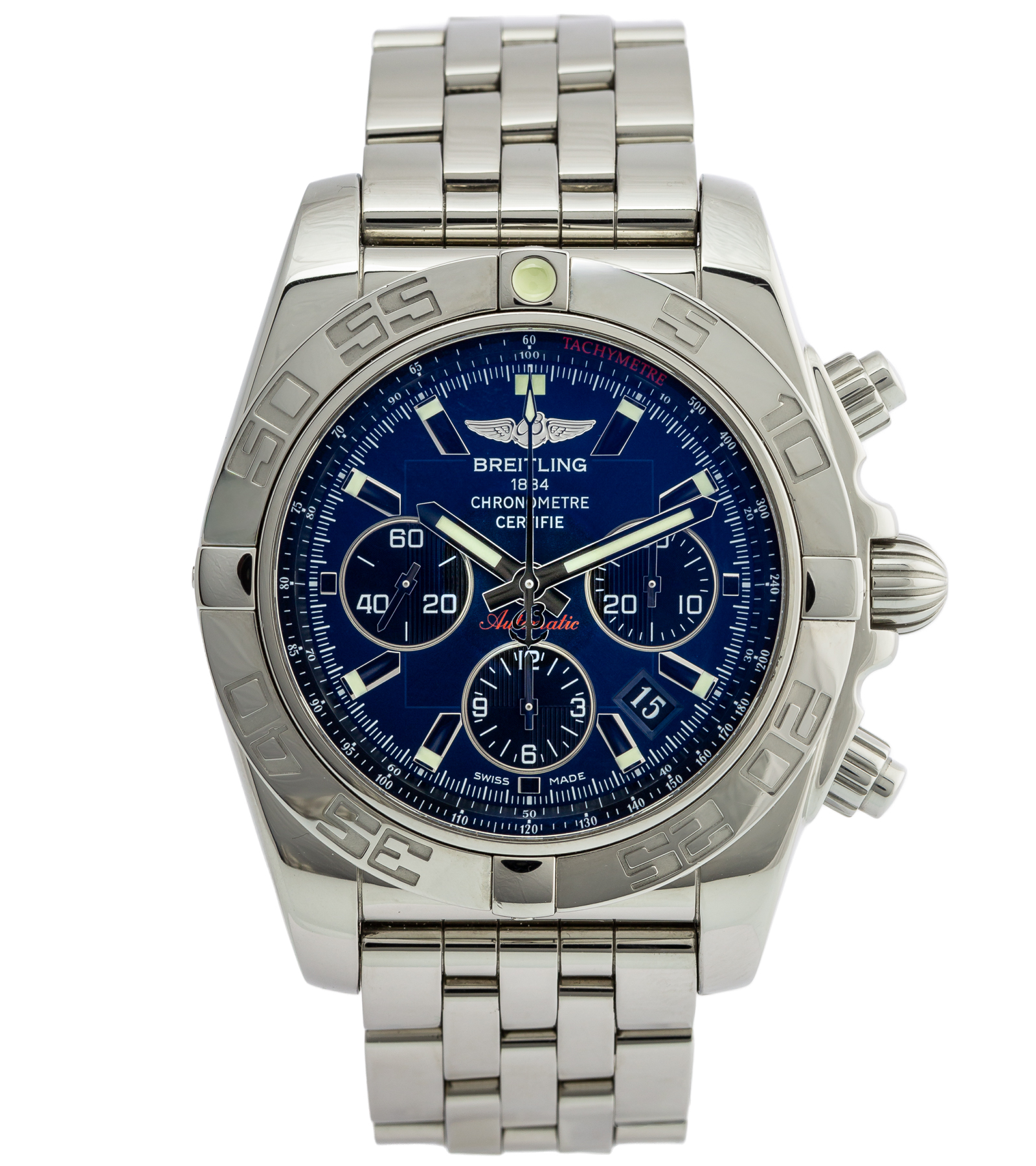 Oryginalny używany zegarek, zachowany w bardzo dobrym stanie. Model Chronomat to już kultowy wzór który można zobaczyć w wielu odmianach. Producent określił wodoszczelność do 500 metrów. Numer referencyjny AB0110 Na jego komplikacje składa się chronograf oraz datownik. W zestawie oryginalne pudełko oraz komplet dokumentów. Pierwsza sprzedaż w 2012 roku.