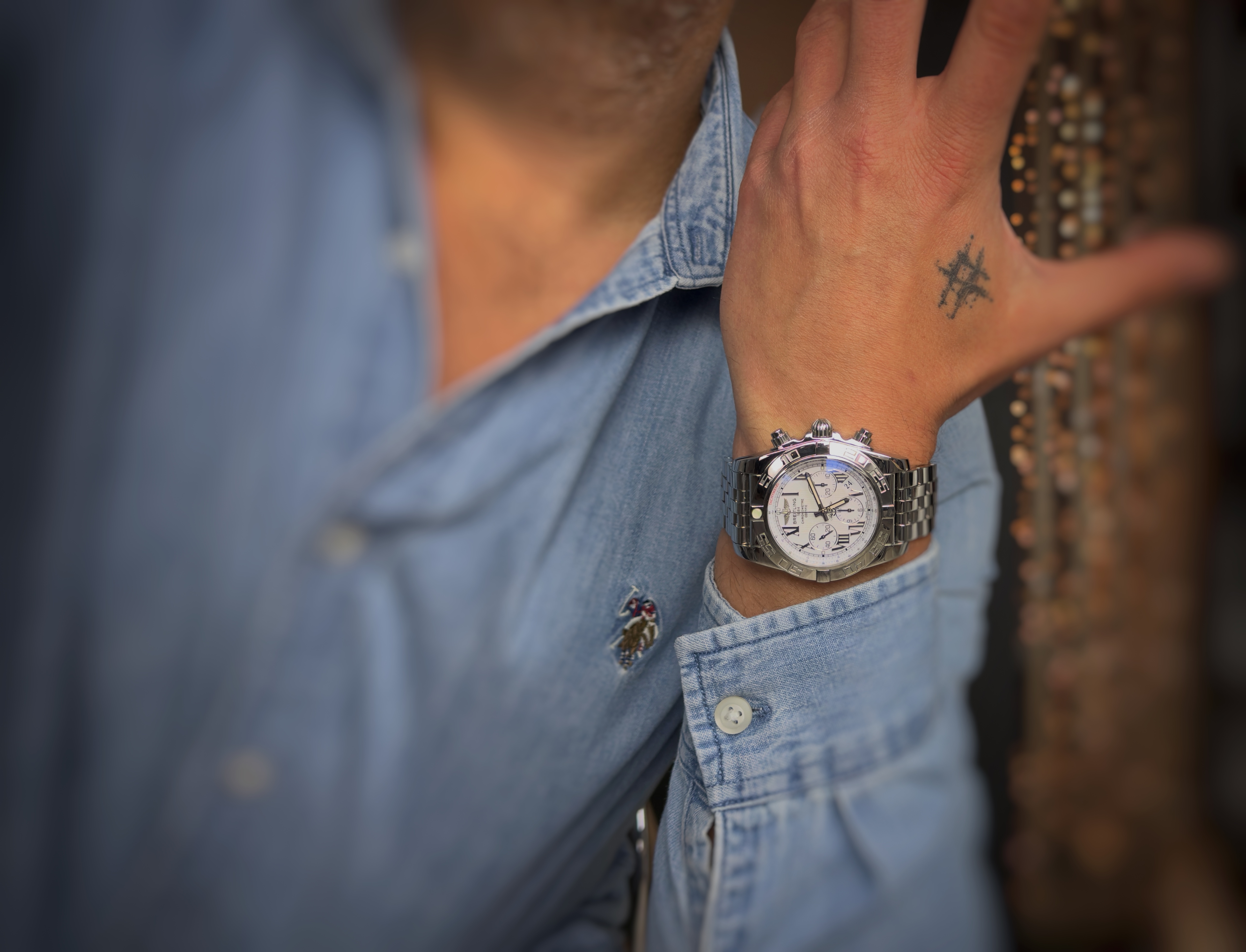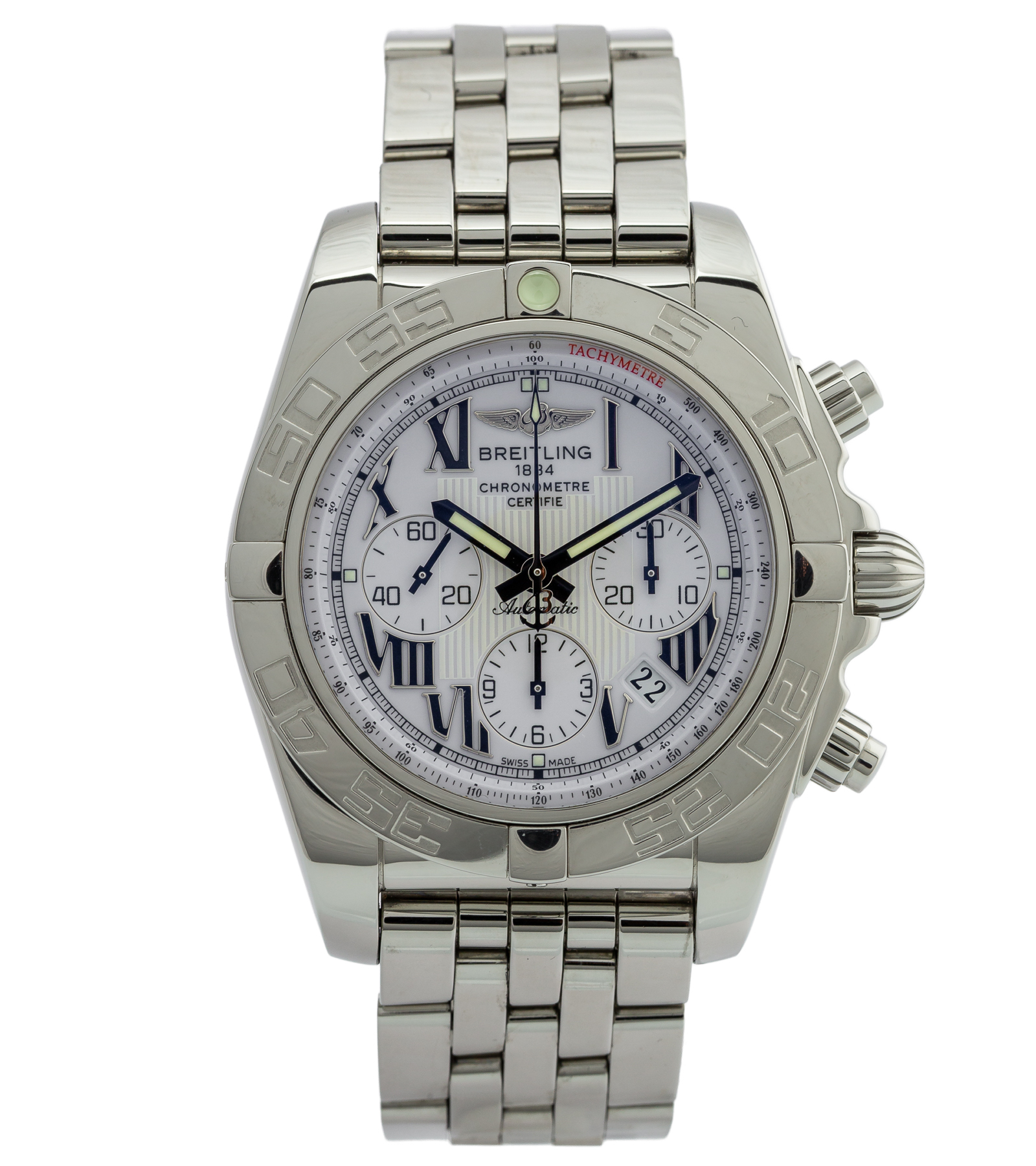Oryginalny używany zegarek, zachowany w bardzo dobrym stanie. Model Chronomat to już kultowy wzór który można zobaczyć w wielu odmianach. Zegarek wyposażony w bransoletę. Producent określił wodoszczelność do 300 metrów. Numer referencyjny AB0110 Na jego komplikacje składa się chronograf oraz datownik. W zestawie oryginalne pudełko. Pierwsza sprzedaż w 2015 roku.
