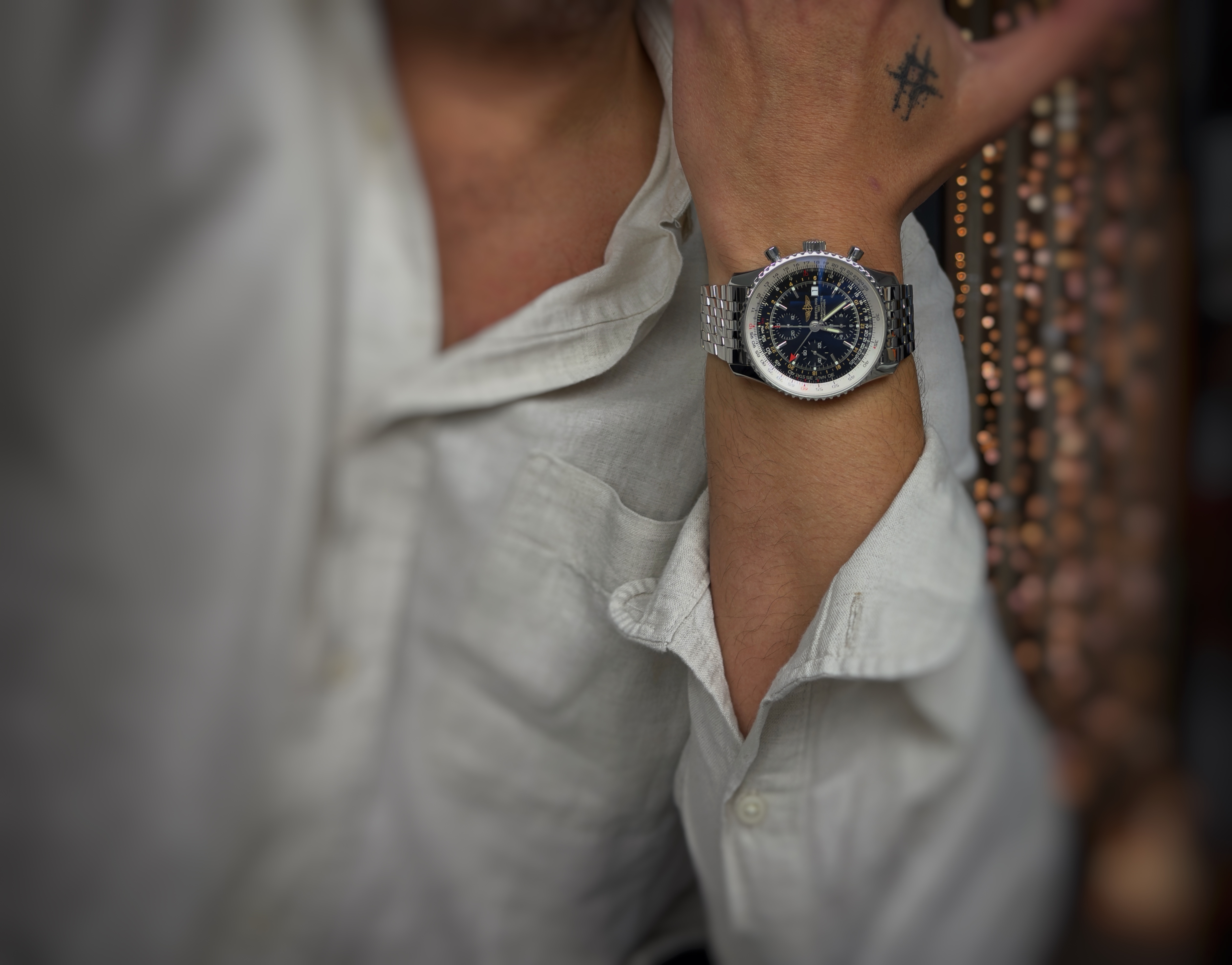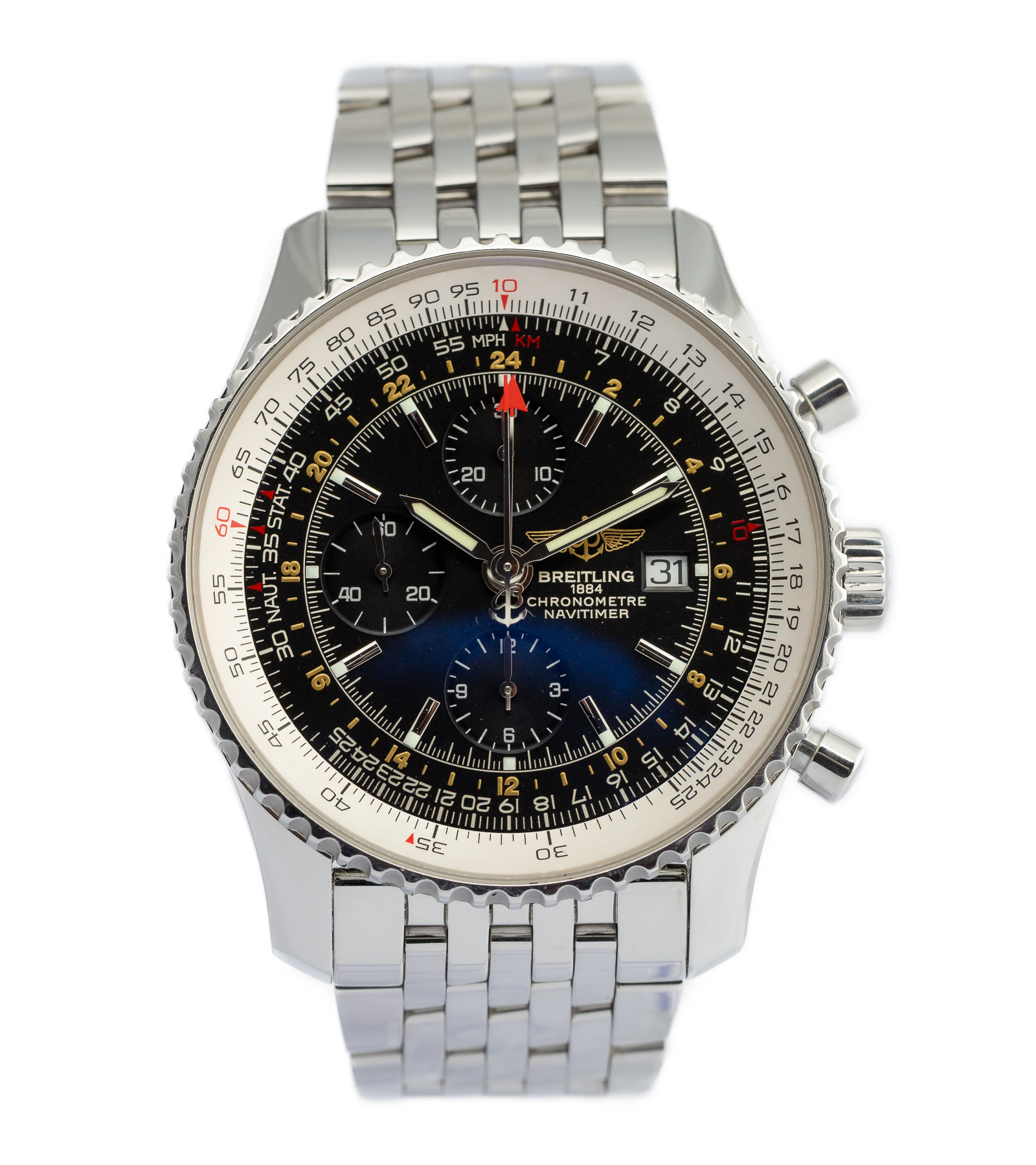 Oryginalny używany zegarek z serii Navitimer, duża wyrazista koperta. Egzemplarz zachowany w bardzo dobrym stanie. Model znany na całym świecie! Producent określił wodoszczelność do 30 metrów. Numer referencyjny A24322 Na jego komplikacje składa się chronograf, tachymetr, data i druga strefa czasowa. Pierwsza sprzedaż w 2004 roku. W zestawie pełen komplet, pudełko i dokumenty.