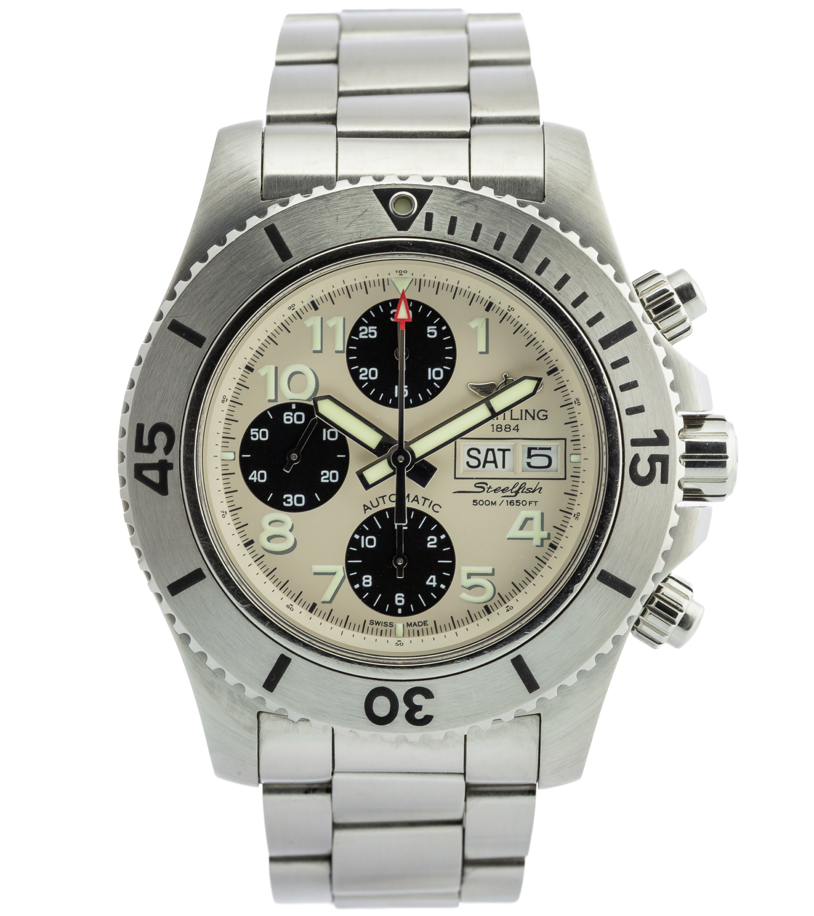 Oryginalny używany zegarek marki Breitling z profesjonalnej linii Superocean, stworzonej z myślą o najbardziej wymagających użytkownikach oraz miłośnikach nurkowania. Model Chronograph II Steelfish to jedna z najbardziej charakterystycznych i solidnych konstrukcji w ofercie marki – łącząca ekstremalną wytrzymałość z funkcjonalnością chronografu.