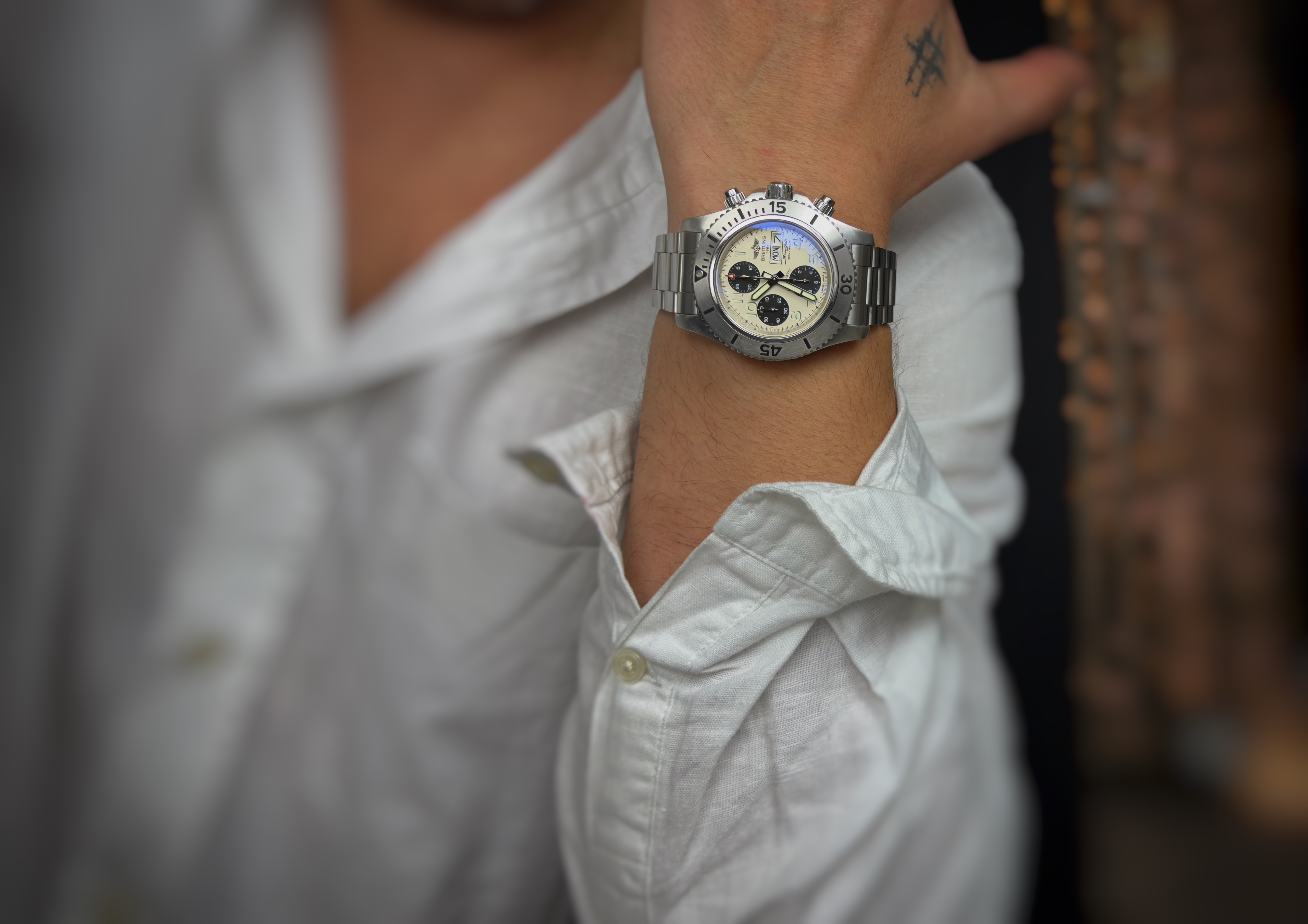 Prezentowany egzemplarz wyróżnia się efektowną konfiguracją „Panda Dial” – jasna, srebrzysta tarcza zestawiona z kontrastowymi, ciemnymi subtarczami chronografu. Taki układ zapewnia doskonałą czytelność oraz nadaje zegarkowi sportowego, a jednocześnie bardzo stylowego charakteru. Masywne indeksy oraz wskazówki pokryte są warstwą luminescencyjną, co gwarantuje widoczność nawet w trudnych warunkach pod wodą.