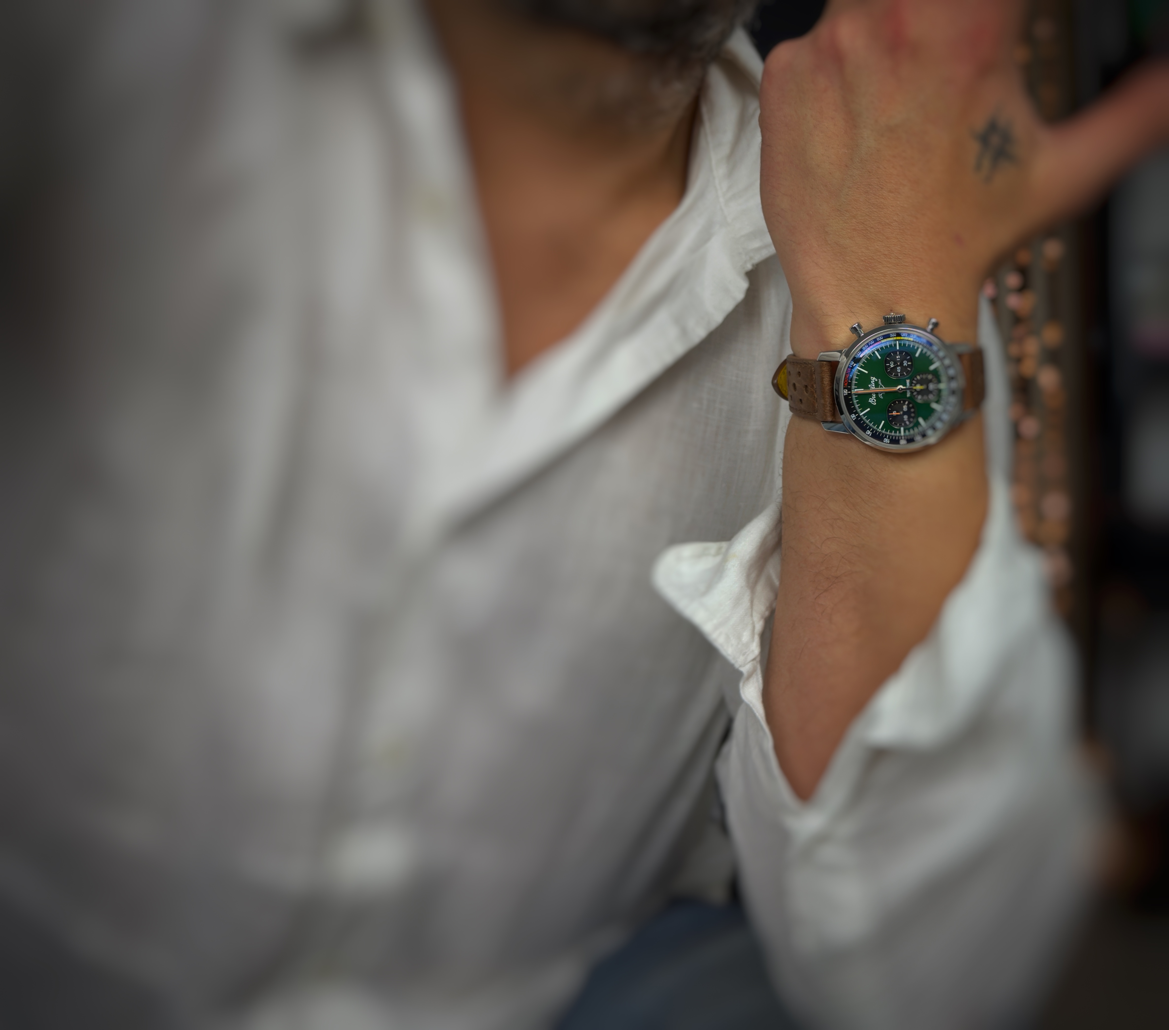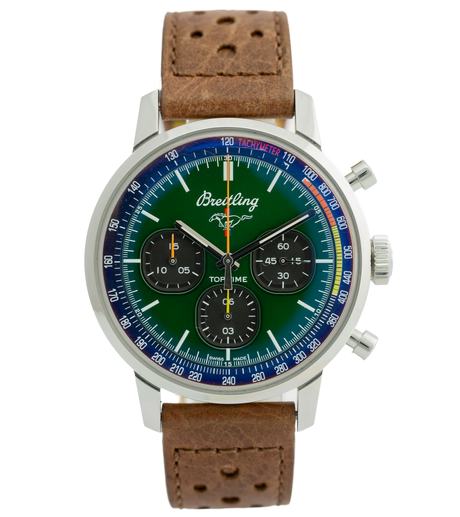 Oryginalny używany zegarek, stan bardzo dobry. Wersja limitowana, wydanie w kilku kolorach zaś nasz egzemplarz to najbardziej topowy model z zieloną tarczą Model Top Time Ford Mustang wyróżnia się barwami i emblematem swojego klasycznego odpowiednika, a także perforowanym skórzanym paskiem wyścigowym, skalą tachymetru i kontrastującymi, okrągłymi tarczami „squircle” (nie do końca kwadratowymi, nie do końca okrągłymi), które przywodzą na myśl klasyczne wskaźniki na desce rozdzielczej.