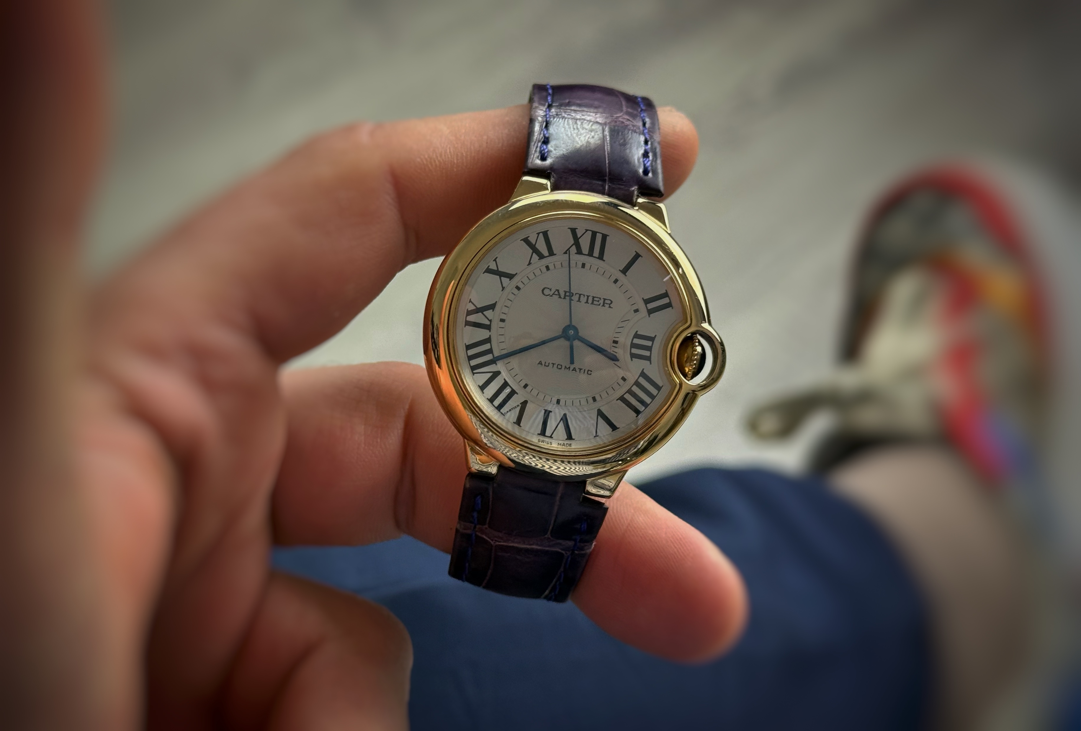 Zegarek posiada oryginalny pasek firmy Cartier oraz oryginalne zapięcie na klamrowe wykonane z żółtego złota.