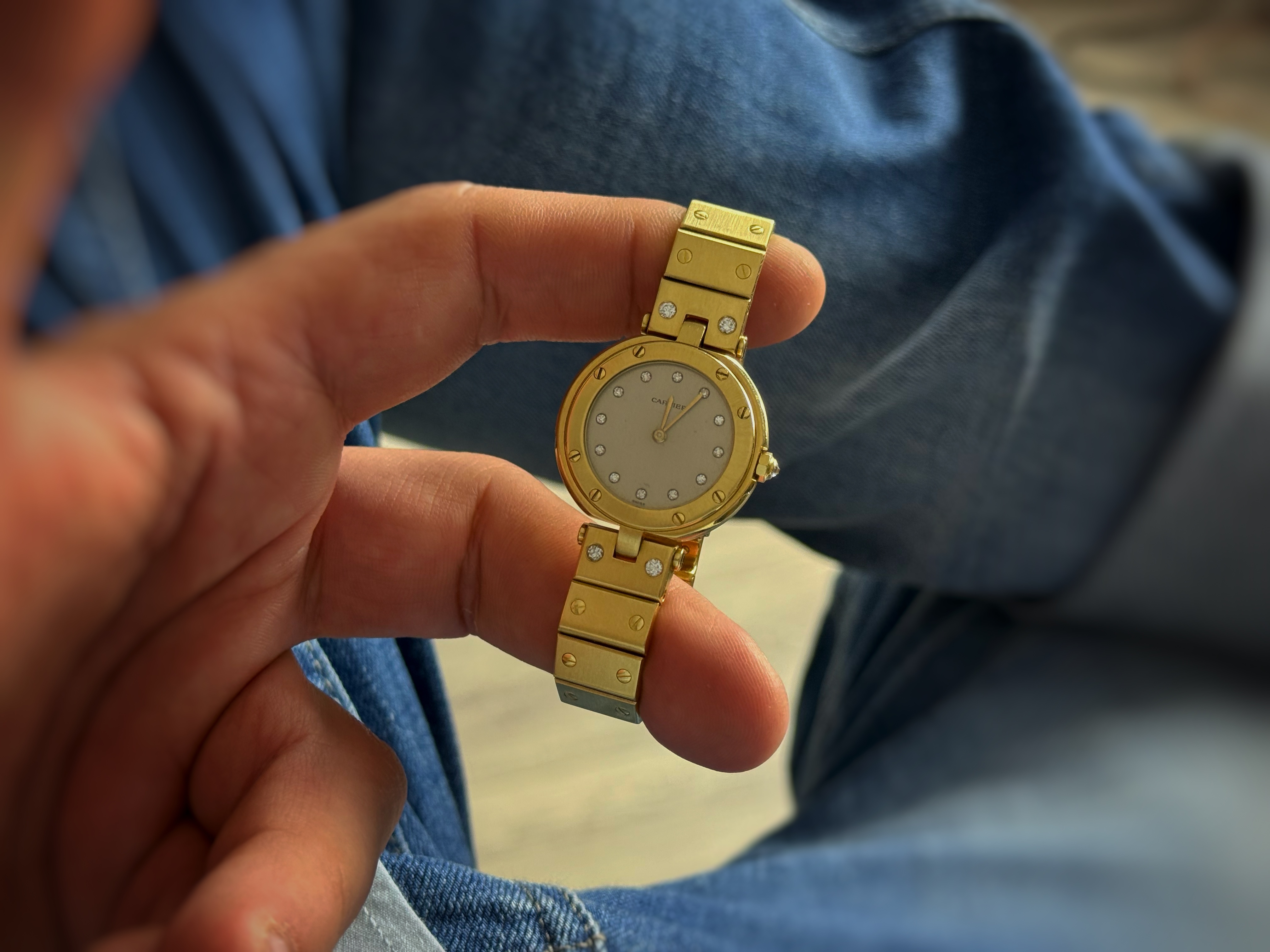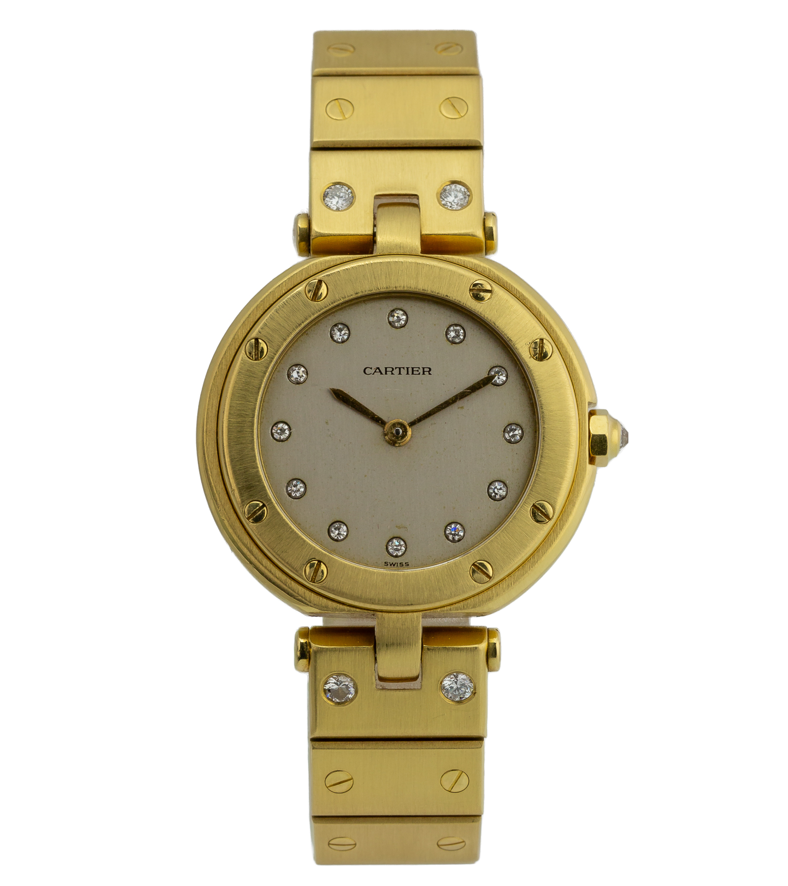 Oryginalny zegarek używany. Cartier Santos Ronde Vendôme w 18-karatowym żółtym złocie z diamentową lunetą to kwintesencja biżuteryjnej elegancji francuskiego domu mody. Model łączy klasyczną, okrągłą kopertę linii Vendôme z luksusowym wykończeniem i subtelną, szarą tarczą, tworząc ponadczasową propozycję dla miłośników wyrafinowanego stylu. Zegarek o niepowtarzalnym wyglądzie, wykonany z żółtego złota.