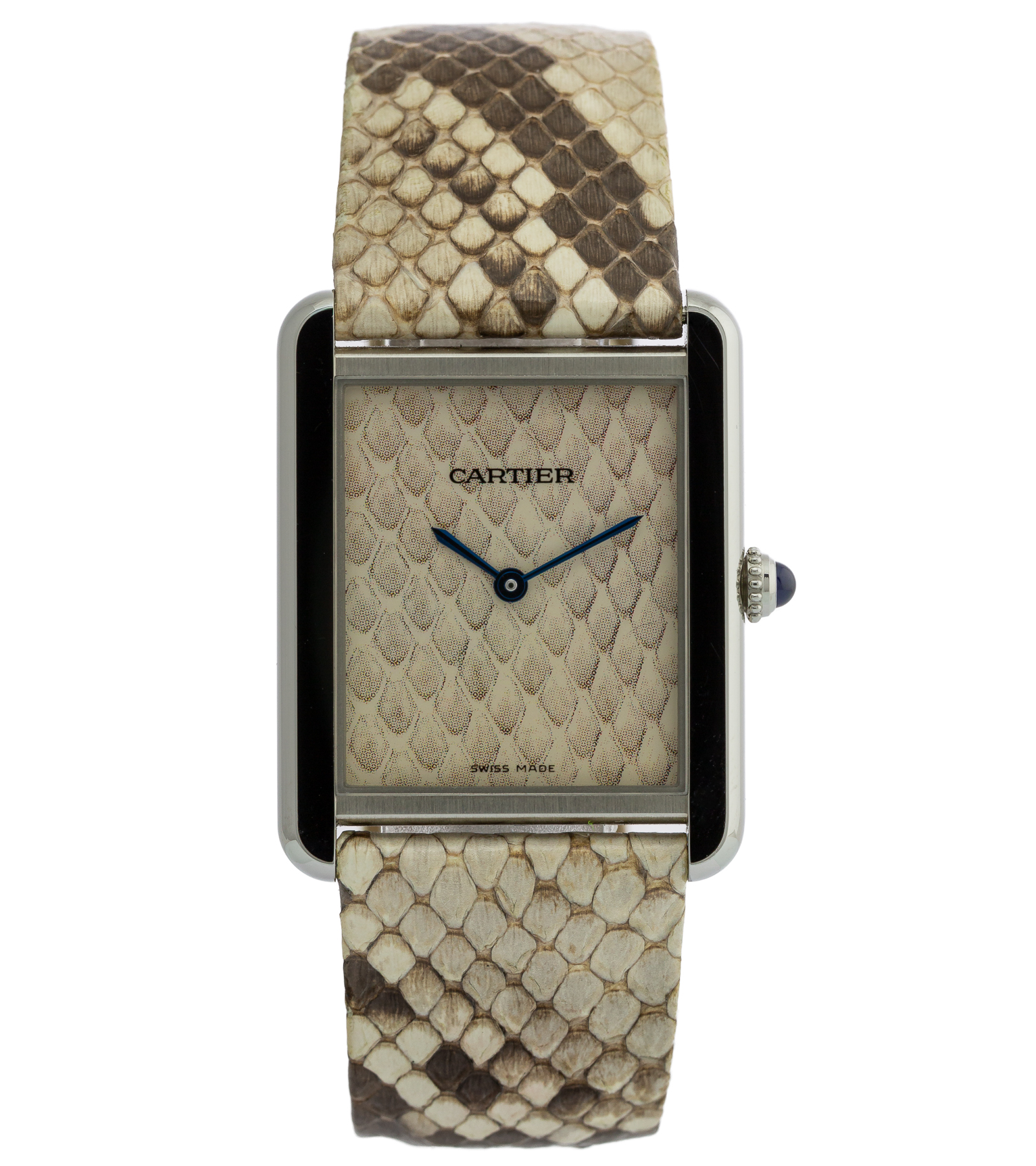 Koperta o wymiarach 28 mm x 35 mm (30 mm z koronką) wysokość 5,5 mm. Koperta wykonana jest ze stali szlachetnej. Wyjątkowa tarcza z motywem python (snake), delikatna faktura inspirowana skórą węża. Klasyczne rzymskie indeksy, charakterystyczne dla Cartiera, oraz niebieskie wskazówki typu sword. Charakterystyczna koronka ozdobiona niebieskim kaboszonem (spinel / syntetyczny szafir) podkreśla DNA marki Cartier. Dekiel przykręcany oraz sygnowany. Szkło szafirowe..