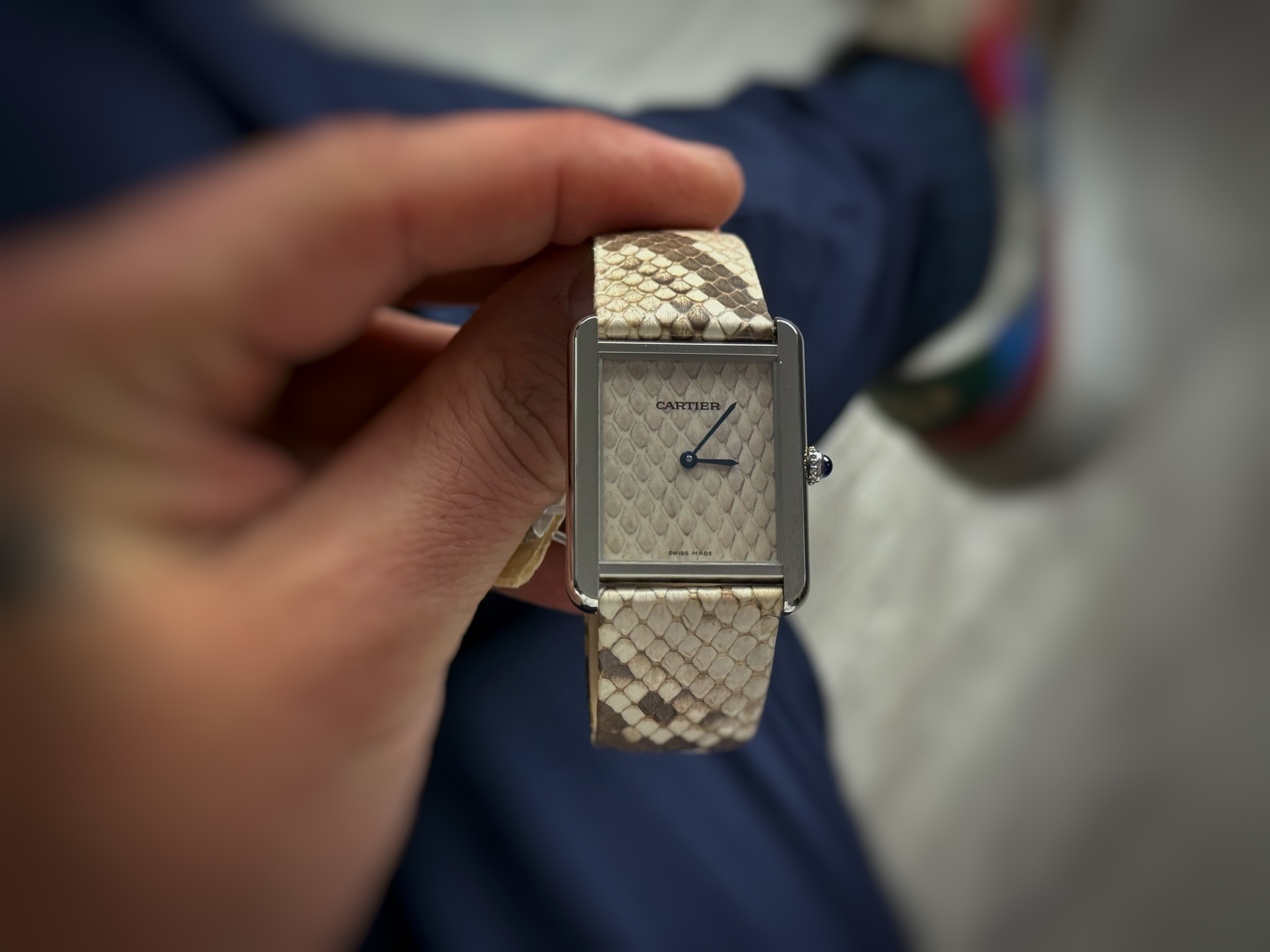 Model oferowany jest na oryginalnym pasku wykonanym ze skóry python (snake), który podkreśla ekskluzywny charakter zegarka. Całość uzupełnia zapięcie motylkowe Cartier.