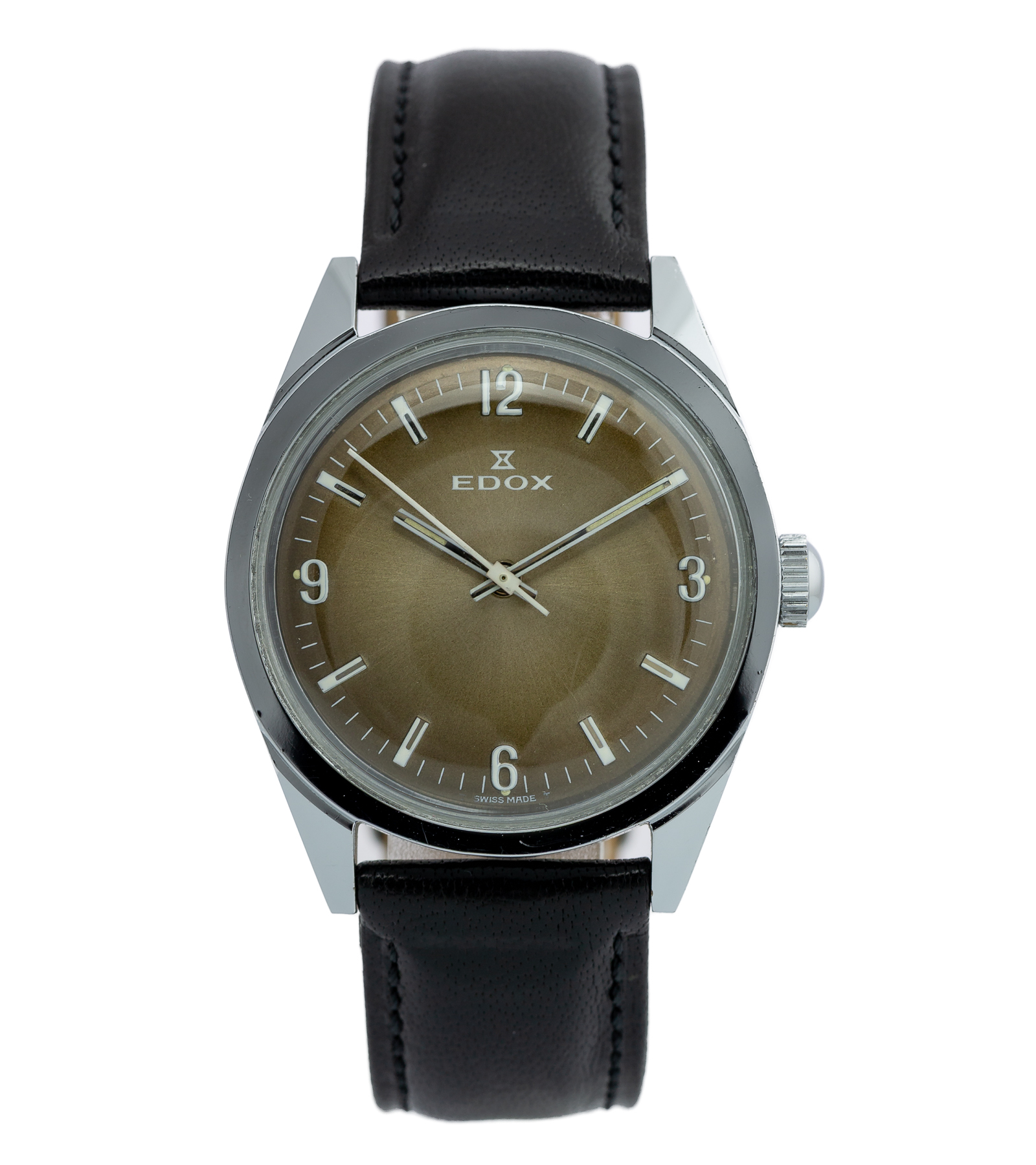 Oferowany zegarek jest oryginalny, używany, w bardzo dobrym stanie jak na swój wiek. Klasyczny model marki Edox z okresu lat 70. XX wieku stanowi doskonały przykład ponadczasowej, minimalistycznej elegancji w stylu vintage. Zegarek wyróżnia się wyjątkową, brązową tarczą typu sunburst, która z biegiem lat nabrała naturalnej patyny, tworząc unikalny efekt tzw. tropical dial. To właśnie ten detal nadaje egzemplarzowi indywidualny charakter i podnosi jego atrakcyjność kolekcjonerską.