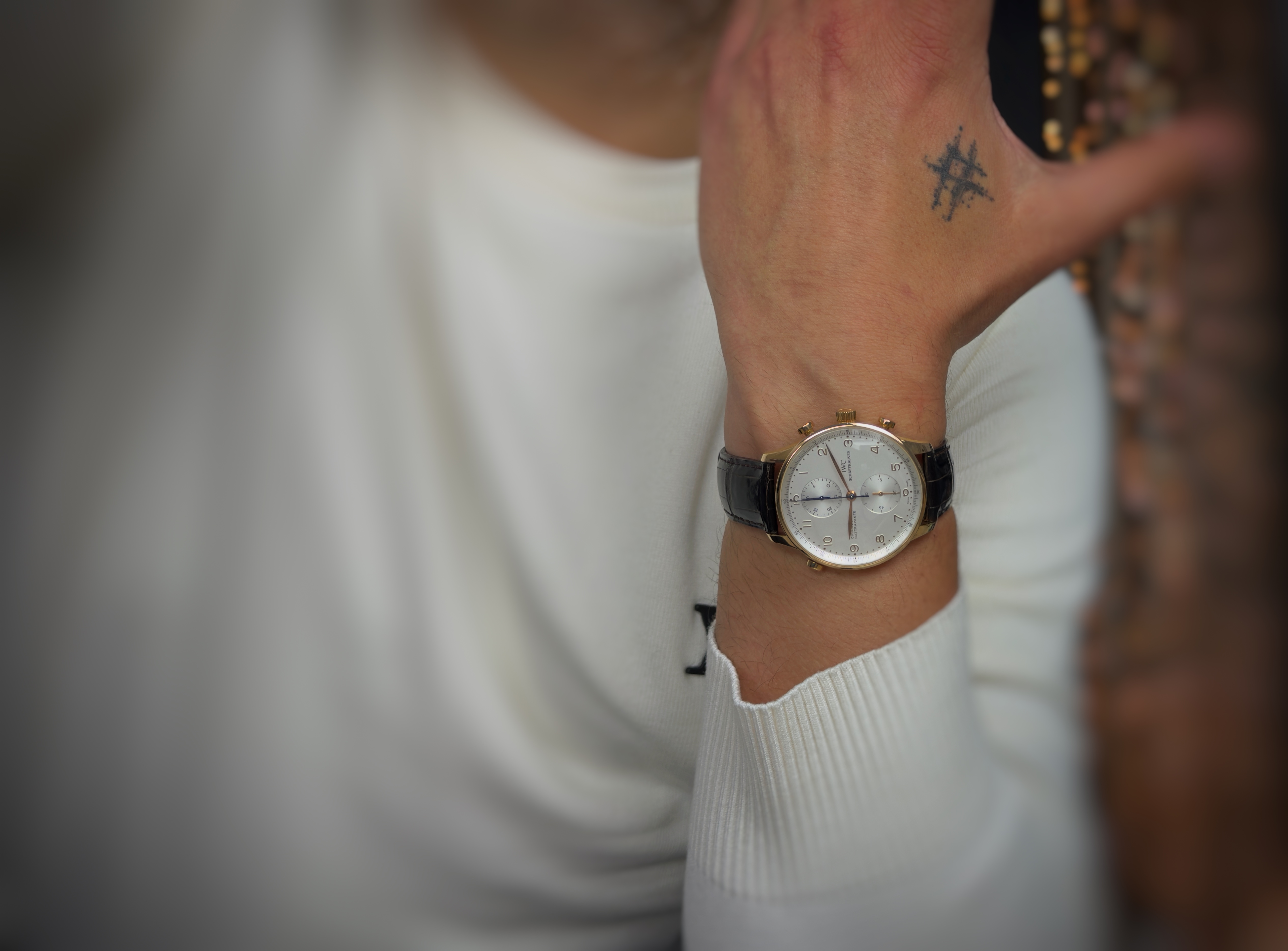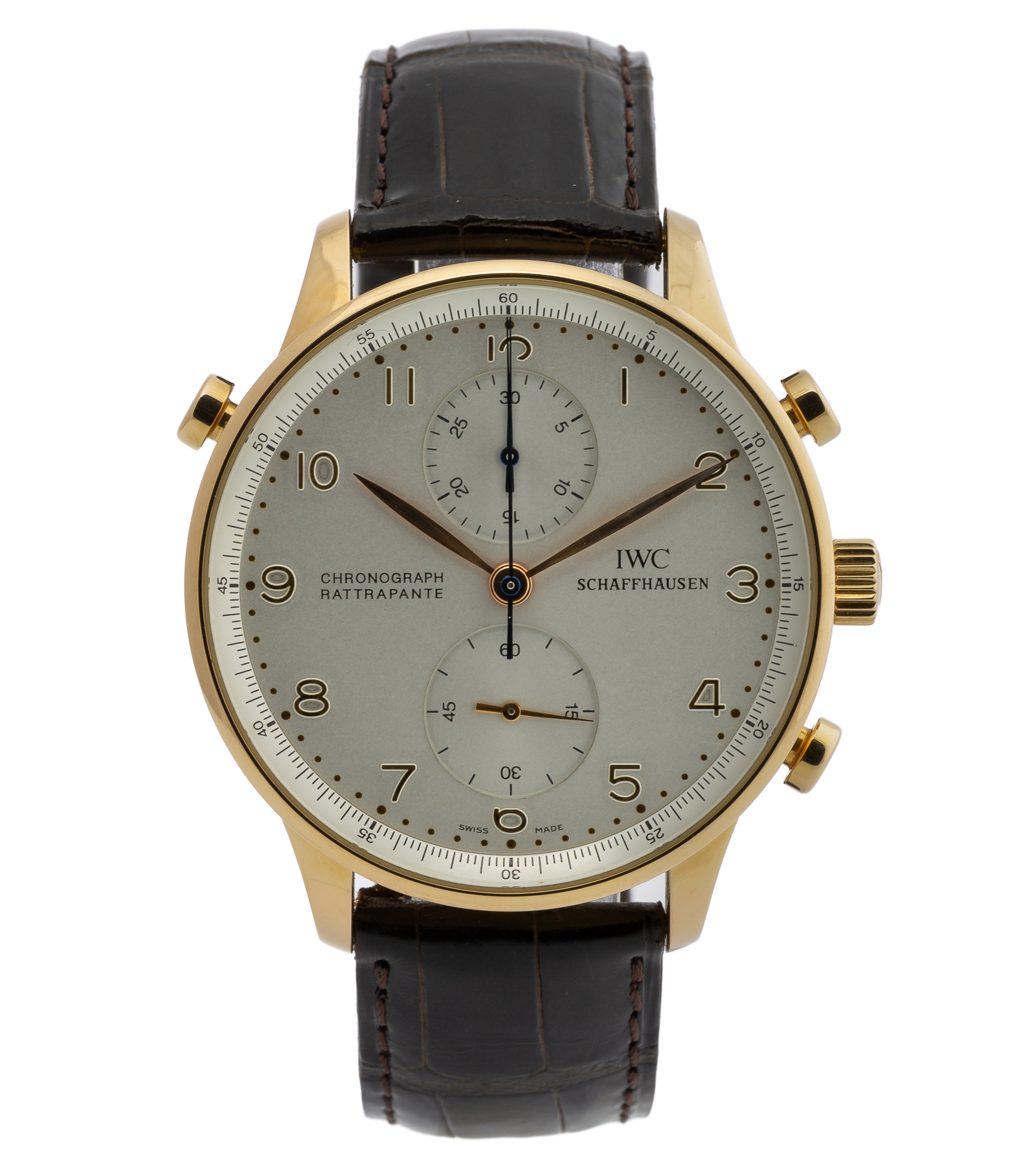Oryginalny zegarek używany, stan jest bardzo dobry. IWC Portuguese Chronograph Rattrapante w różowym złocie to zegarek, który łączy w sobie dwa światy: klasyczną elegancję linii Portuguese oraz jedną z najbardziej fascynujących komplikacji w zegarmistrzostwie — rattrapante (split-seconds). Wersja z mechanizmem manualnym podkreśla purystyczny charakter tej referencji, będąc idealnym wyborem dla kolekcjonerów ceniących tradycję, precyzję i luksusowy styl. Wodoszczelność określona przez producenta 30 metrów. Zegarek z 2010 roku. W zestawie oryginale pudełko. Numer referencyjny to IW371203