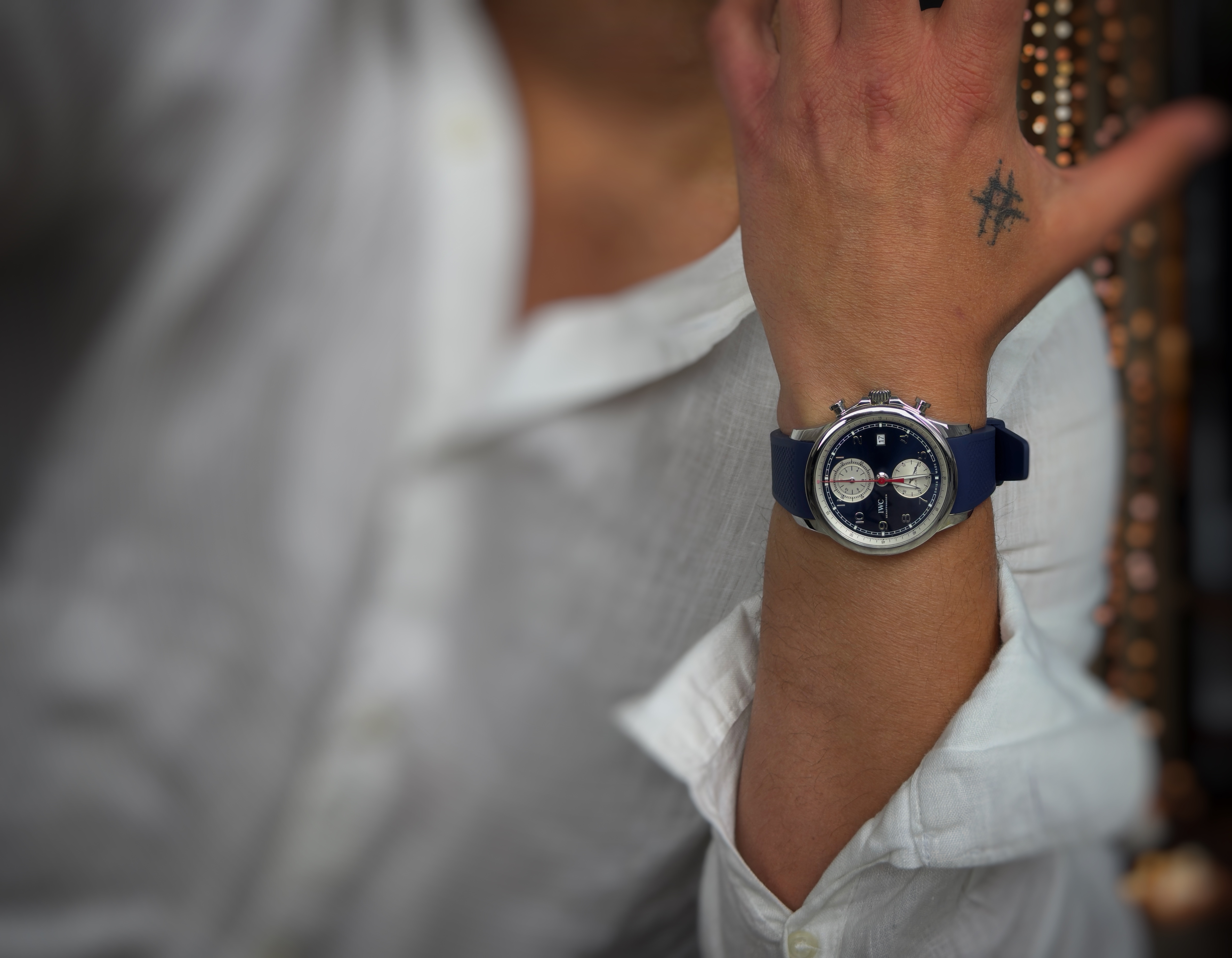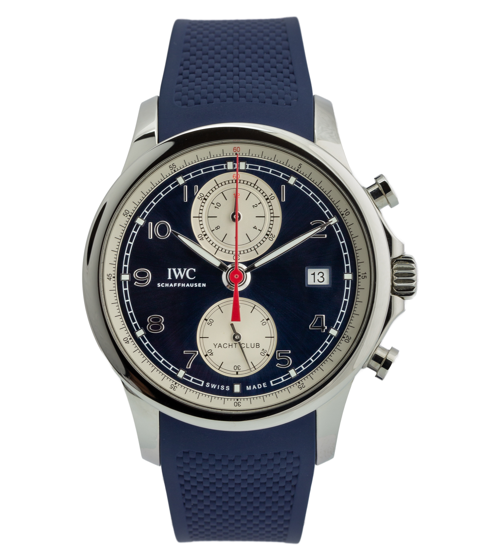 Oferowany zegarek jest oryginalny, używany, w bardzo dobrym stanie. IWC Portuguese Yacht Club Chronograph to ikoniczny model z kolekcji Portugieser – połączenie elegancji klasycznych zegarków garniturowych z funkcjonalnością sportowego chronografu o morskiej proweniencji. Ten czasomierz odzwierciedla fascynację marką IWC żeglugą i doskonały styl inżynieryjny, idealny zarówno na pokładzie jachtu, jak i w codziennym życiu.