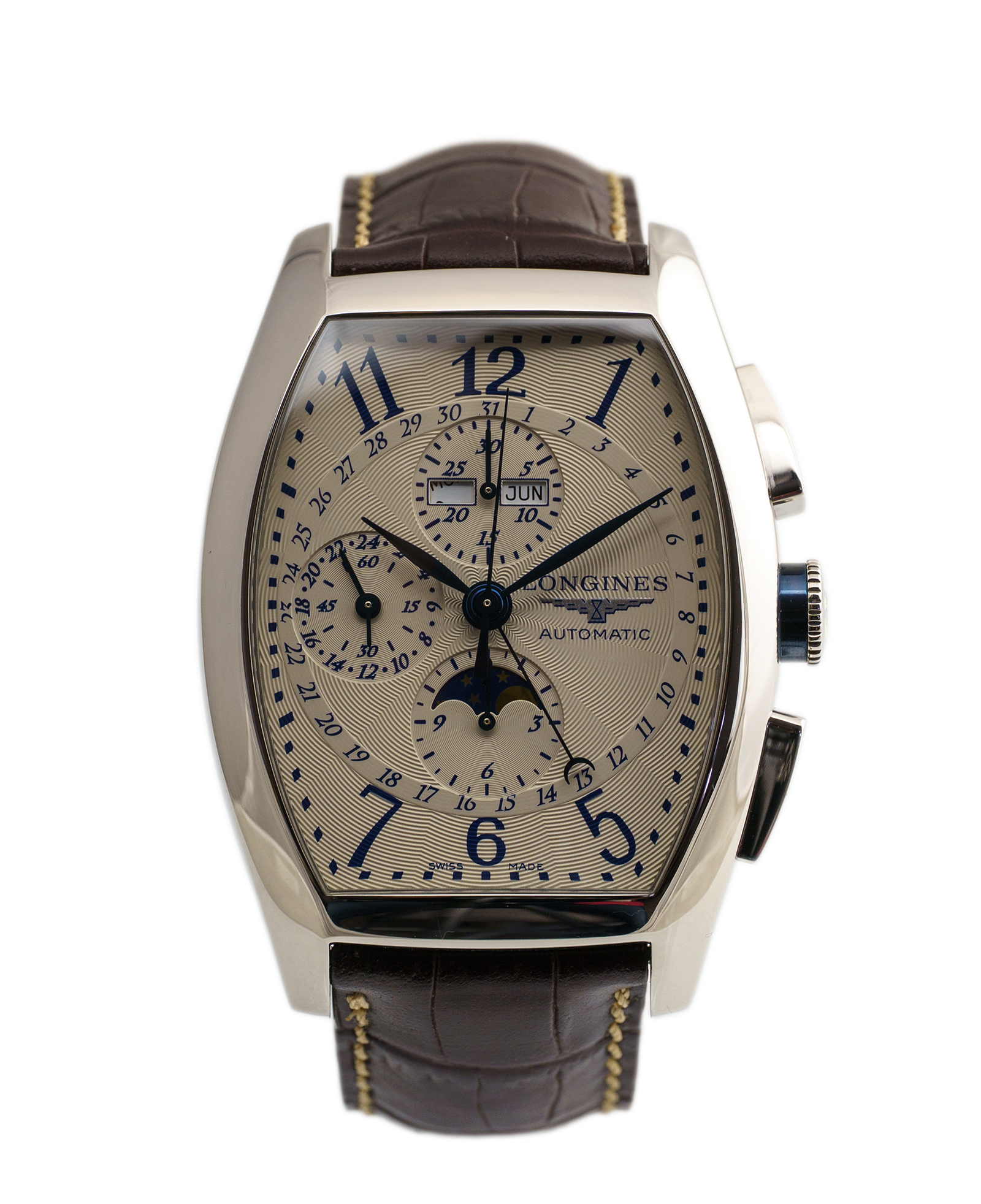 Oryginalny męski używany zegarek w bardzo dobrym stanie. Longines Evidenza, to przykład klasycznego zegarka w rzadko spotykanym kształcie tonneau (beczka). Dany model będzie pasował do szerokiej palety strojów. Na jego komplikacje składa się datownik, chrongraf oraz fazy księżyca . Oferowany model posiada oryginalne pudełko oraz komplet dokumentów. Numer referencyjny L2.688.4. Wodoszczelność określona przez producenta 30 metrów. Pierwsza sprzedaż w 2013 roku
