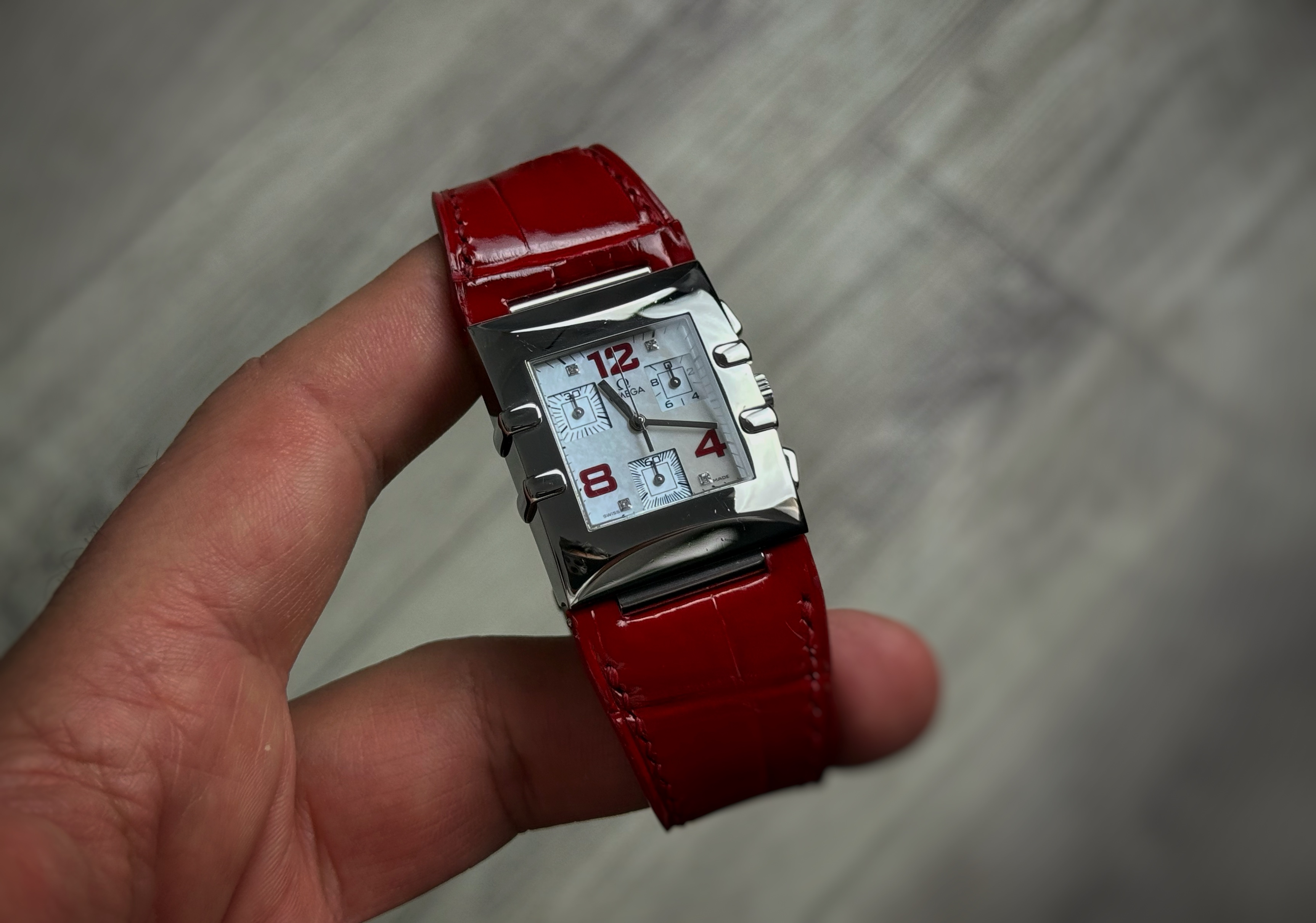 Zegarek posiada nowy pasek z skóry krokodyla w kolorze czerwonym z zapięciem na jeden zatrzask firmy Omega.
