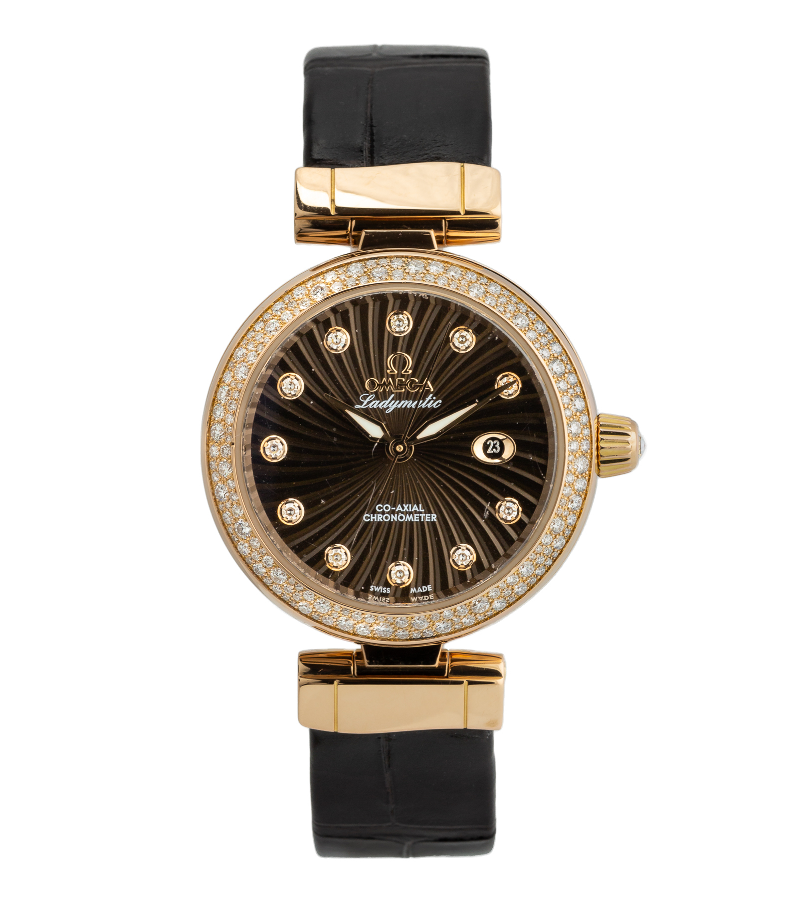 Oryginalny zegarek damski używany. Omega De Ville Ladymatic to kwintesencja kobiecej elegancji w luksusowym wydaniu. Model wykonany z 18-karatowego czerwonego złota, zestawiony z ciepłą, brązową tarczą oraz skórzanym paskiem, tworzy wyjątkowo harmonijną i ponadczasową kompozycję. To zegarek stworzony dla kobiet ceniących klasę, precyzję oraz prestiż szwajcarskiego zegarmistrzostwa. Numer referencyjny 425.68.34.20.63.001 W zestawie oryginalne pudełko firmy Omega Pierwsza sprzedaż nastąpiła w 2017 roku. Producent wodoszczelność określił na 100 metrów.
