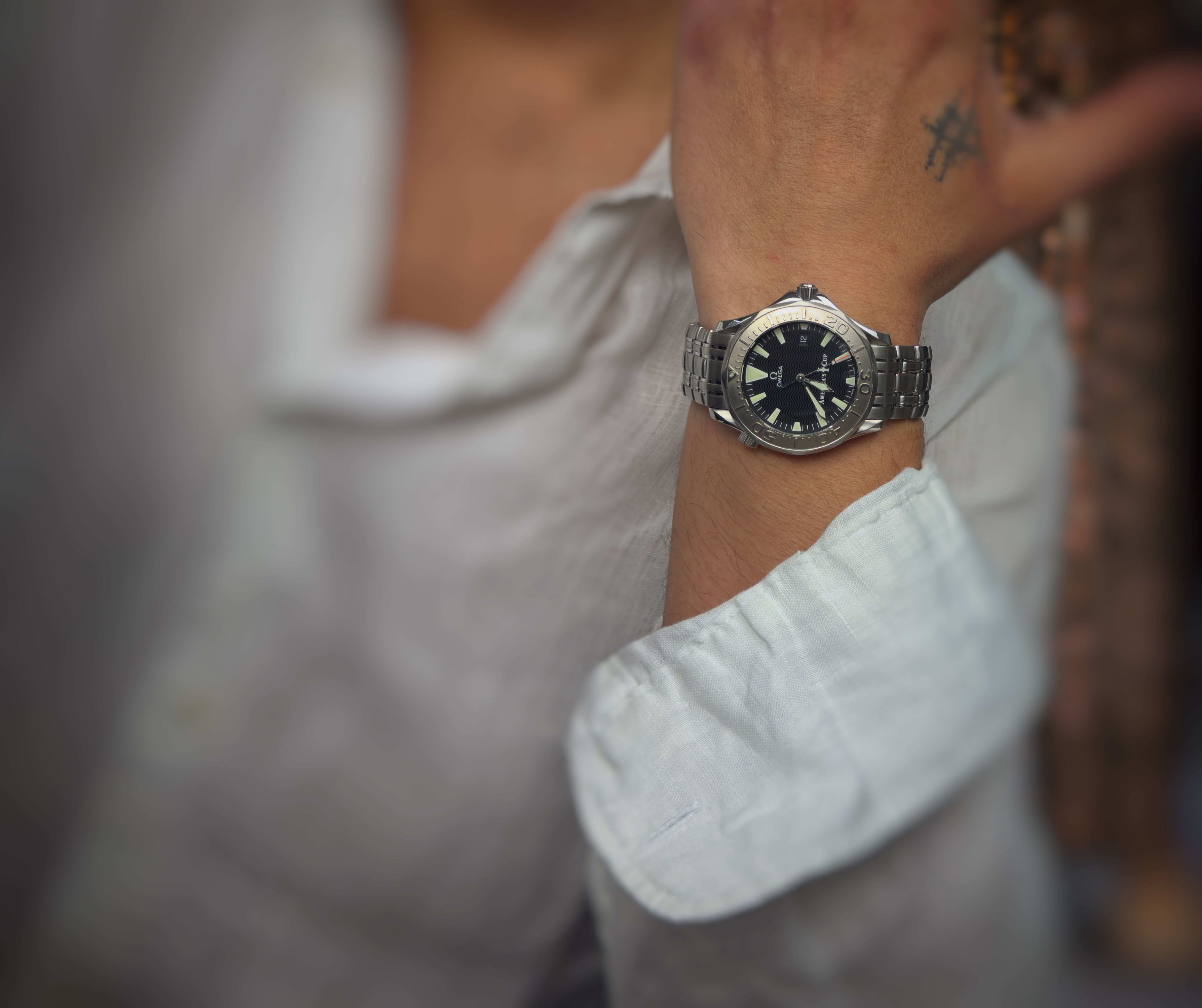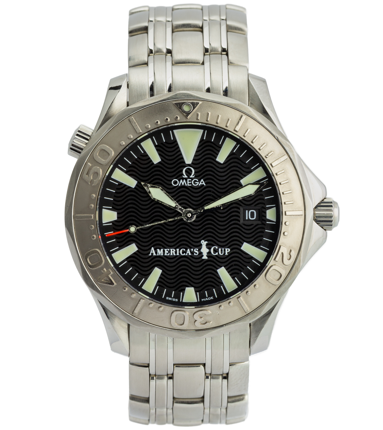 Wyjątkowa, kolekcjonerska odsłona kultowego divera od Omega, stworzona z okazji prestiżowych regat America’s Cup. Dany model to jeden z najbardziej charakterystycznych Seamasterów przełomu lat 90. i 2000 – łączy klasyczny design linii Diver 300M z unikalnymi detalami limitowanej edycji. Czarna tarcza z charakterystycznym falistym wzorem, typowa dla tej generacji Seamasterów, zapewnia świetną czytelność i ponadczasowy wygląd. Wskazówki typu „sword hands” oraz wyraźne indeksy pokryte masą luminescencyjną gwarantują doskonałą widoczność w każdych warunkach – zarówno pod wodą, jak i w codziennym użytkowaniu.