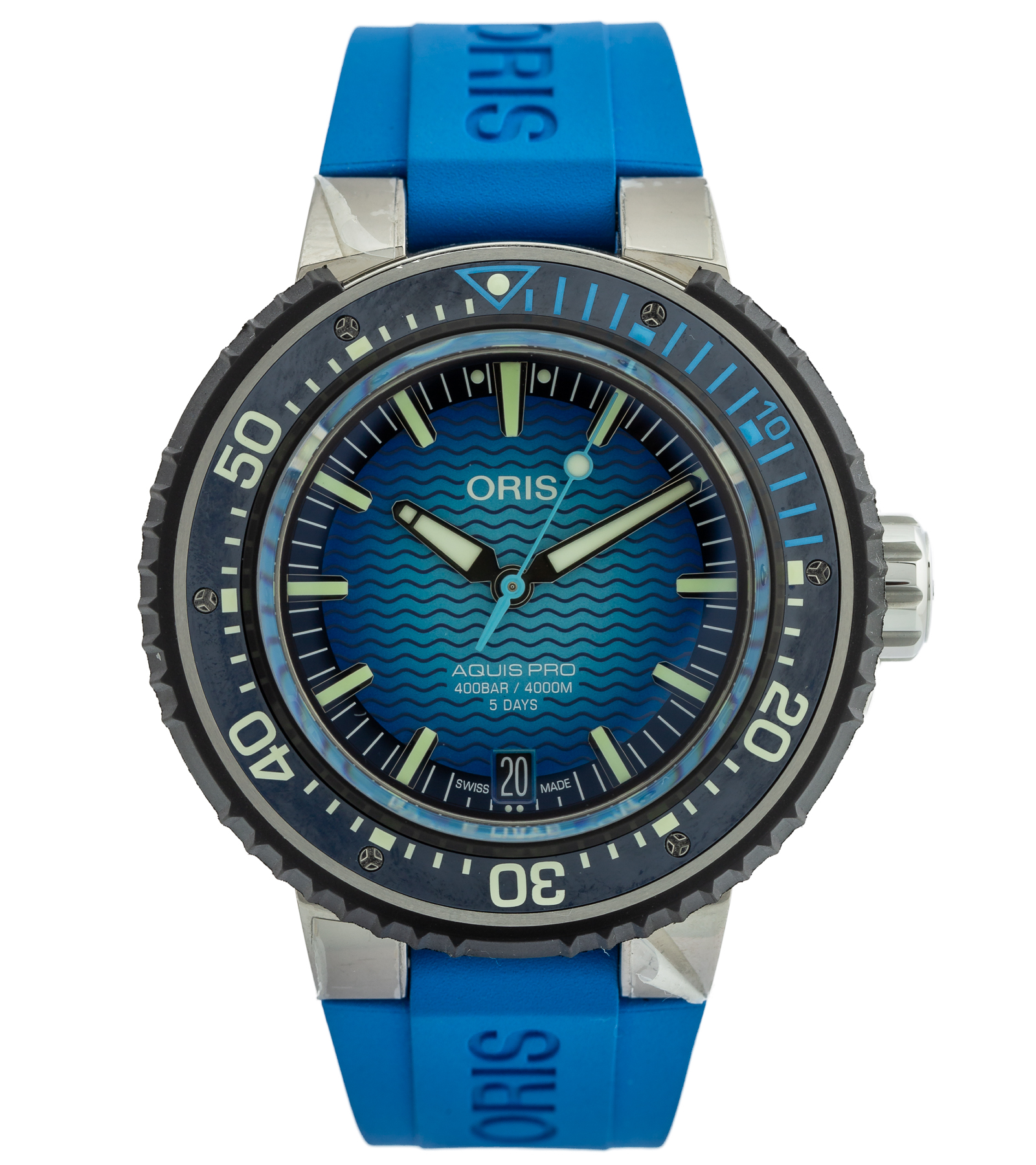 Oferowany zegarek jest oryginalny, używany, jednakże wygląda jak nowy. Oris Aquis Pro 4000 m to bezkompromisowy, profesjonalny zegarek nurkowy zaprojektowany do pracy w ekstremalnych warunkach głębinowych. Model ten stanowi szczytowe osiągnięcie techniczne w kolekcji Aquis i jest jednym z najbardziej zaawansowanych zegarków nurkowych dostępnych na rynku. Monumentalna koperta o średnicy 49,5 mm, wykonana z tytanu, zapewnia wyjątkową odporność przy zachowaniu relatywnie niskiej wagi. Zegarek oferuje wodoszczelność do 4000 metrów, co czyni go narzędziem klasy profesjonalnej, przeznaczonym dla nurków zawodowych i entuzjastów ekstremalnych wypraw. Charakterystycznym elementem modelu jest opatentowany przez Oris system Rotation Safety System (RSS), zabezpieczający bezel przed przypadkowym przestawieniem.