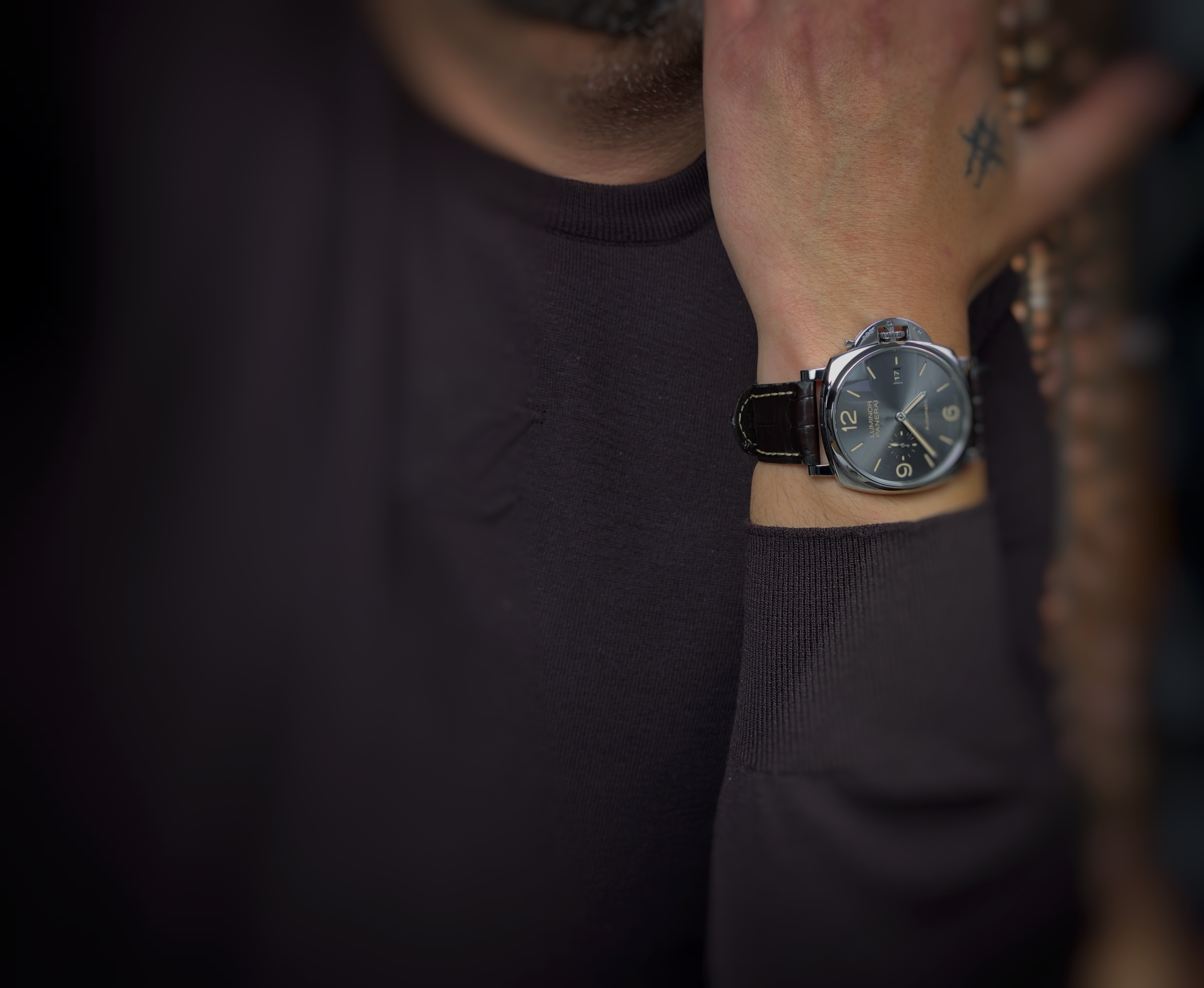 Model wyróżnia się elegancką szarą tarczą o subtelnym szlifie słonecznym, która doskonale współgra z klasyczną kopertą Panerai. Duże arabskie indeksy oraz wskazówki wypełnione masą luminescencyjną zapewniają doskonałą czytelność, będąc jednocześnie jednym z najbardziej rozpoznawalnych elementów stylistycznych marki