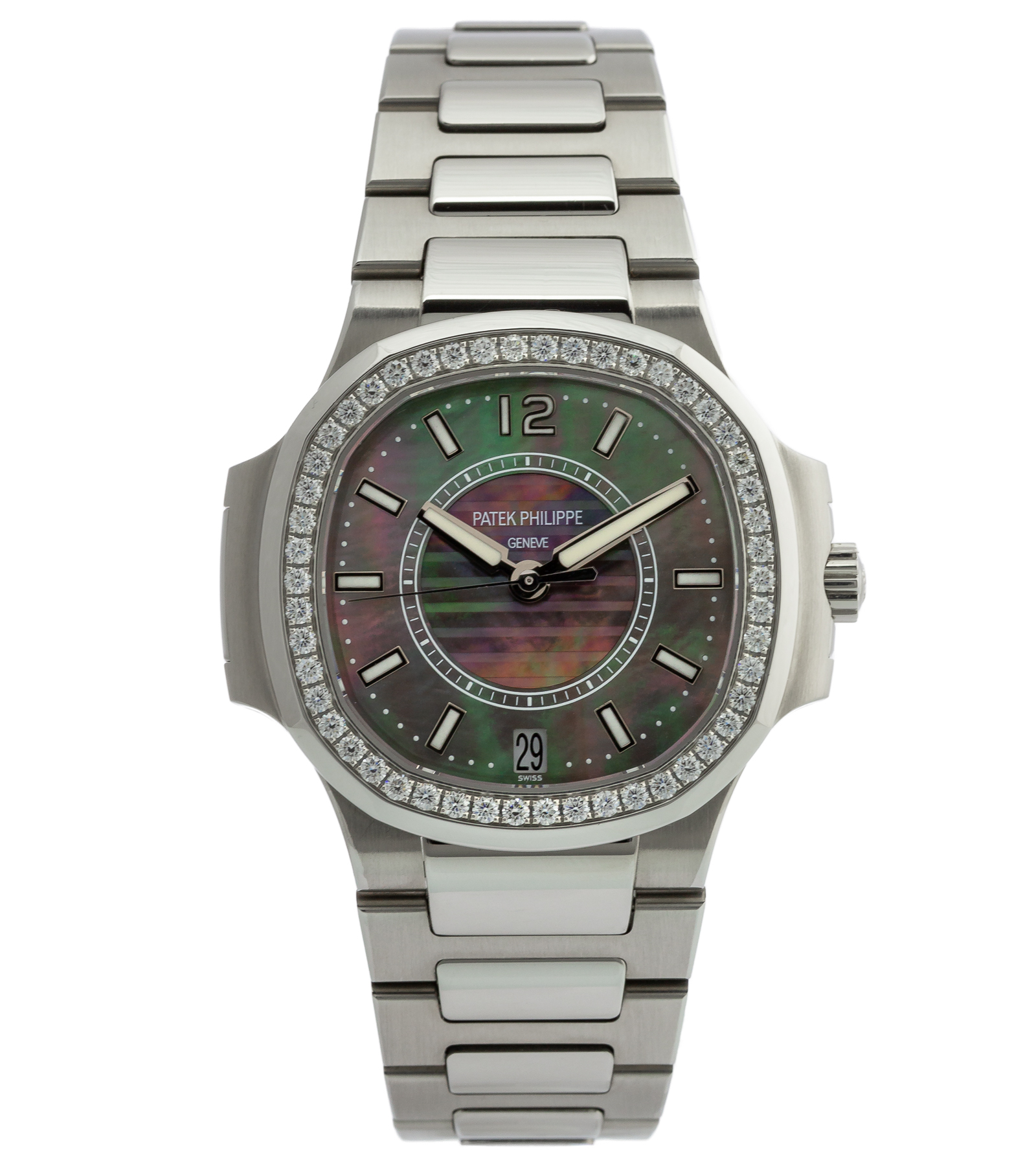 Oryginalny zegarek używany zachowany w stanie jak nowy! Patek Philippe Nautilus wyróżnia się charakterystyczną kopertą w kształcie poduszki, typową dla linii Nautilus, która została zaprojektowana tak, aby łączyć sportową elegancję z luksusowym wykończeniem. Tarcza z masy perłowej (MOP) zachwyca naturalną głębią, zmieniając odcienie w zależności od światła i dodając zegarkowi subtelnego, kobiecego uroku. Otaczający tarczę bezel został starannie wysadzony diamentami, które podkreślają wysoką jakość wykonania i luksusowy charakter modelu — idealnie komponując się z delikatnymi refleksami masy perłowej.