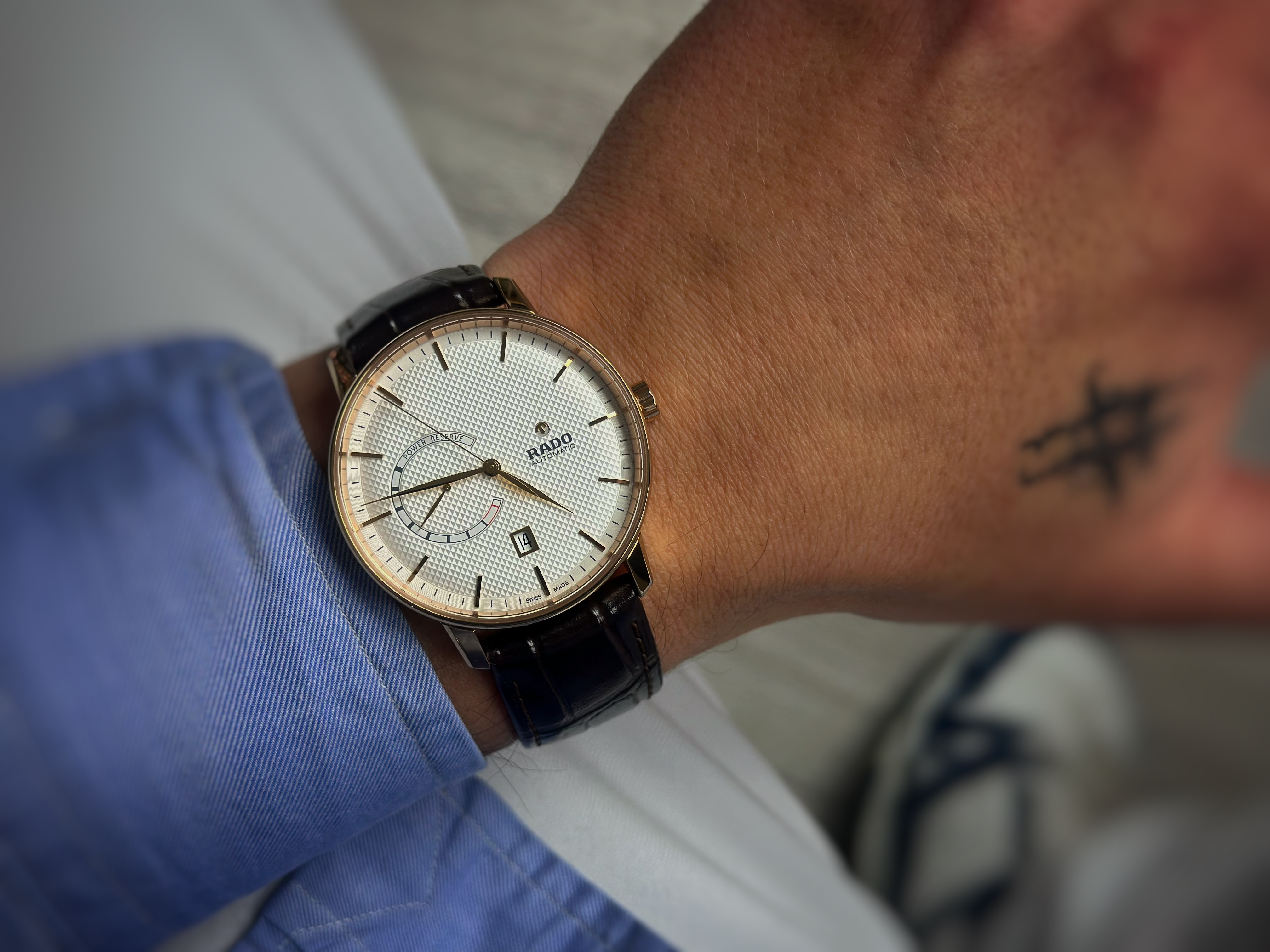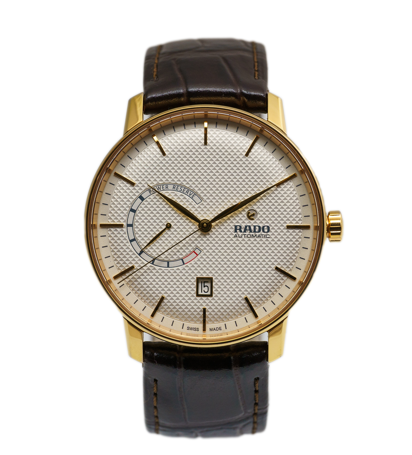 Oryginalny męski zegarek używany – stan idealny, niemal jak nowy – brak śladów noszenia. Dany model wykonany jest ze stali z złotą powłoką PVD, koperta 41 mm. Na komplikacje składa się data oraz wskazanie rezerwy chodu. Oferowany model posiada oryginalne pudełko oraz komplet dokumentów. Numer referencyjny R22879205 Wodoszczelność określona przez producenta 50 metrów. Pierwsza sprzedaż w 2023 roku.