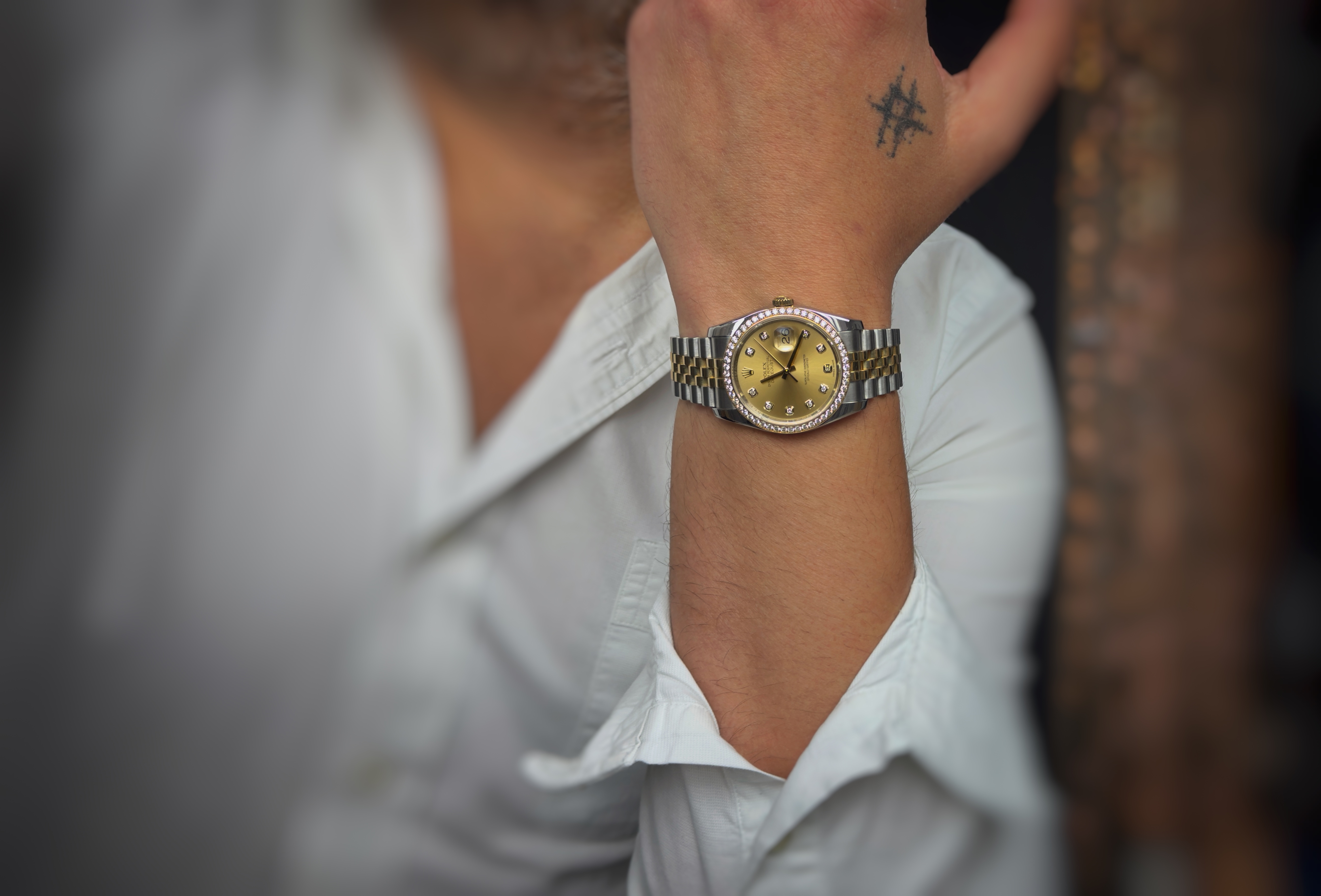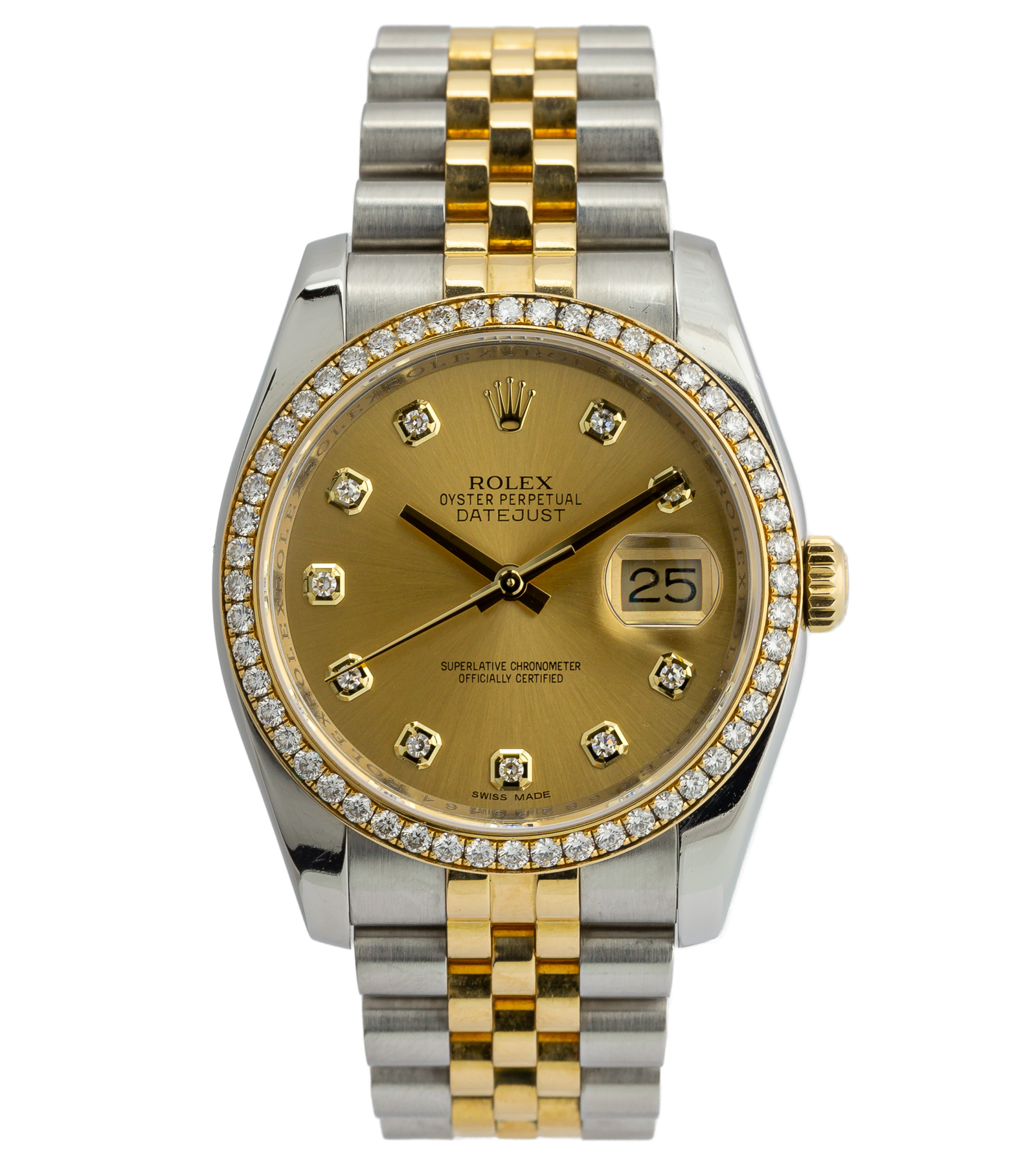 Oryginalny używany zegarek, zachowany w bardzo dobrym stanie. Rolex Datejust to elegancka interpretacja jednego z najbardziej rozpoznawalnych modeli w historii marki Rolex. Zegarek łączy klasyczną stylistykę kolekcji Datejust z luksusowym wykończeniem w konfiguracji Rolesor, zestawiającej stal Oystersteel z 18-karatowym żółtym złotem. Wersja ta wyróżnia się fabryczną diamentową tarczą oraz fabrycznie wysadzanym diamentami bezelem, co nadaje modelowi wyjątkowo ekskluzywny charakter.