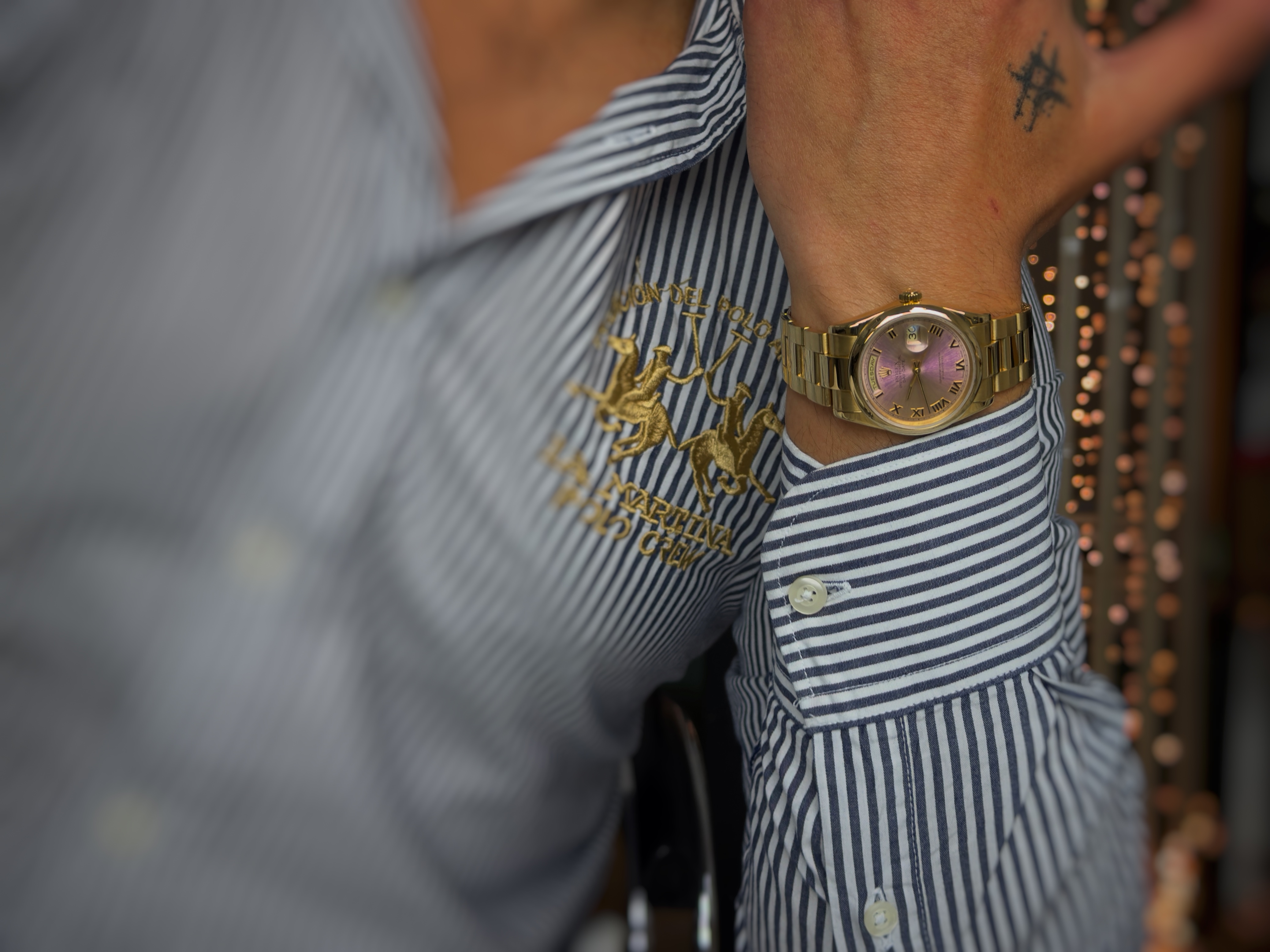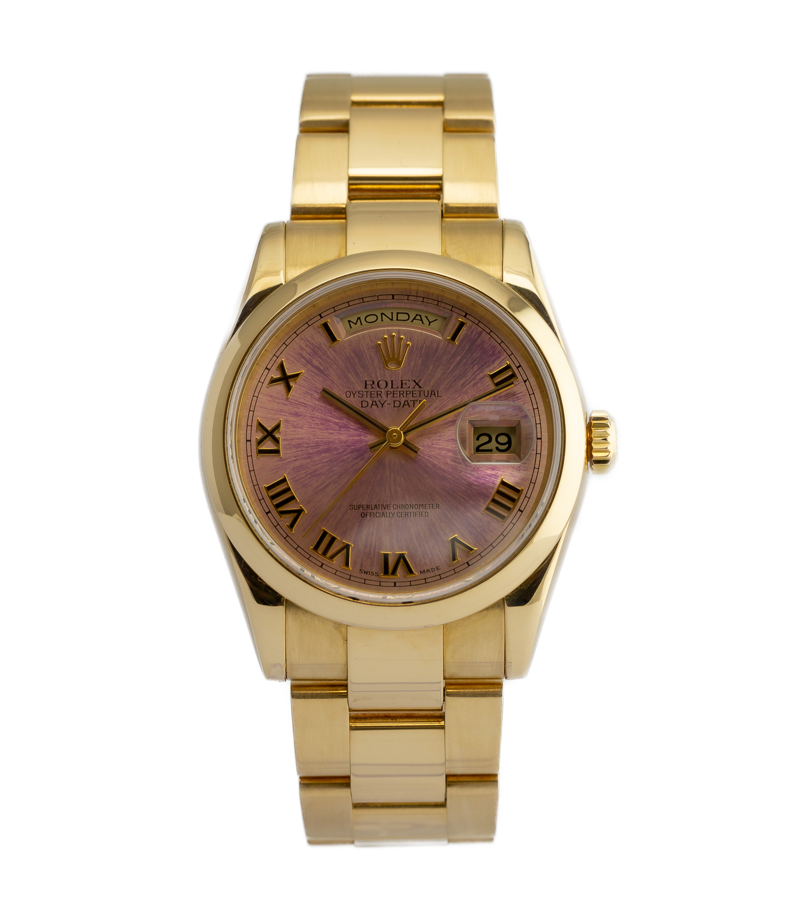 Oryginalny używany, stan bardzo dobry. Kultowy model wykonany w całości ze złota. Zegarek prezentuje się wspaniale, a jednocześnie jest świetną lokatą kapitału. Tarcza zegarka z szlifem słonecznym, z złotego koloru zmieniła się na purpurowy. Numer referencyjny 118208. Na jego komplikacje składa się datownik. Oferowany zegarek posiada oryginalne etui firmy Rolex-a. Pierwsza sprzedaż w 2000 roku.