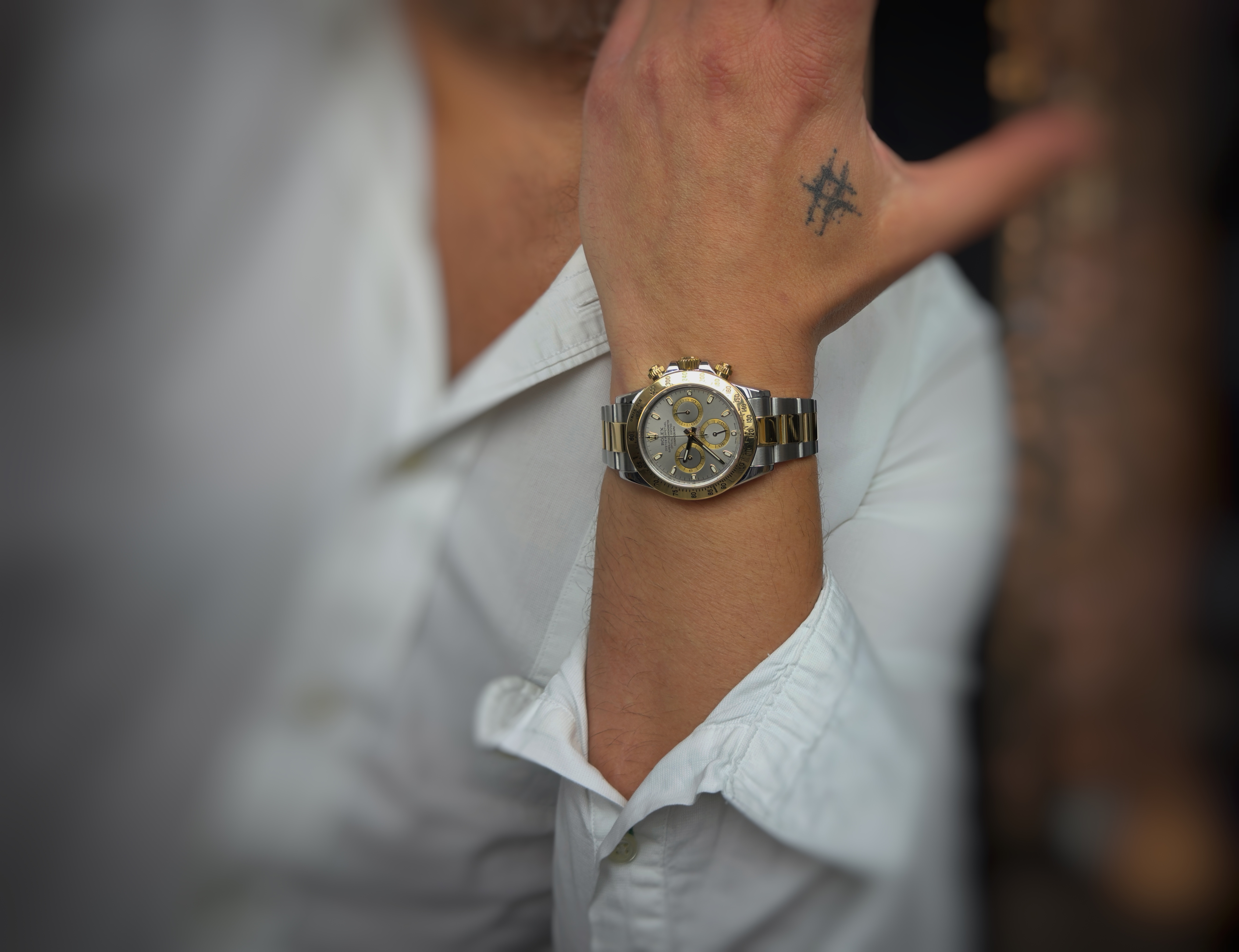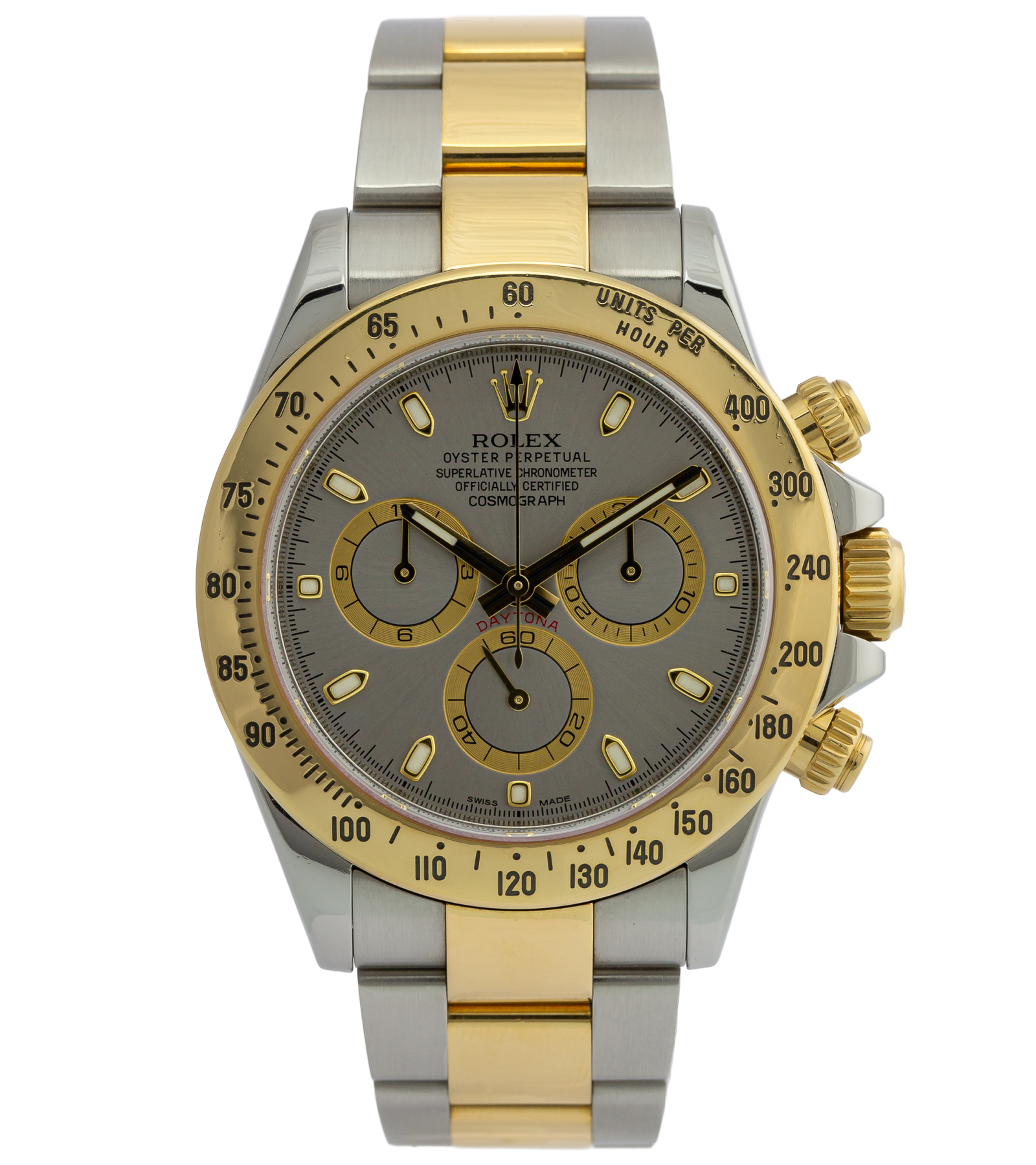 Oryginalny zegarek używany, ale stan określamy na bardzo dobry. Rolex Cosmograph Daytona to wyjątkowe połączenie sportowej funkcjonalności i luksusowej estetyki charakterystycznej dla kolekcji Daytona. Model ten wykonany został w konfiguracji Rolesor – zestawiającej stal Oystersteel z 18-karatowym żółtym złotem – co nadaje zegarkowi elegancki, a jednocześnie dynamiczny charakter. Wersja z szarą tarczą (Grey Dial) wyróżnia się subtelną kolorystyką oraz kontrastowymi licznikami chronografu, które podkreślają sportowe dziedzictwo modelu.