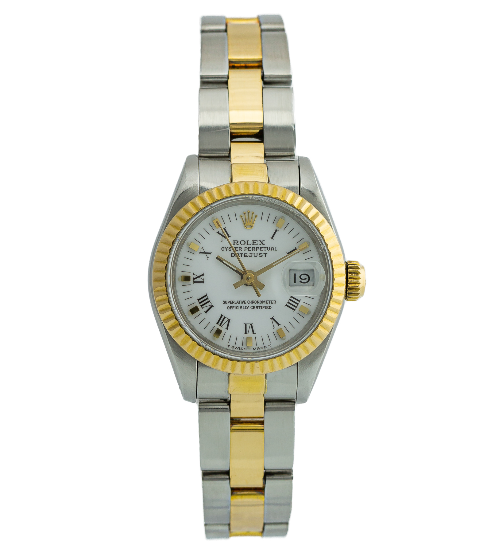 Oryginalny używany damski zegarek, stan bardzo dobry. Wyprofilowana, wypolerowana koperta Oyster połączenie stali oraz złota, biała tarcza z cyframi rzymskimi. Producent określił wodoszczelność do 100 metrów.