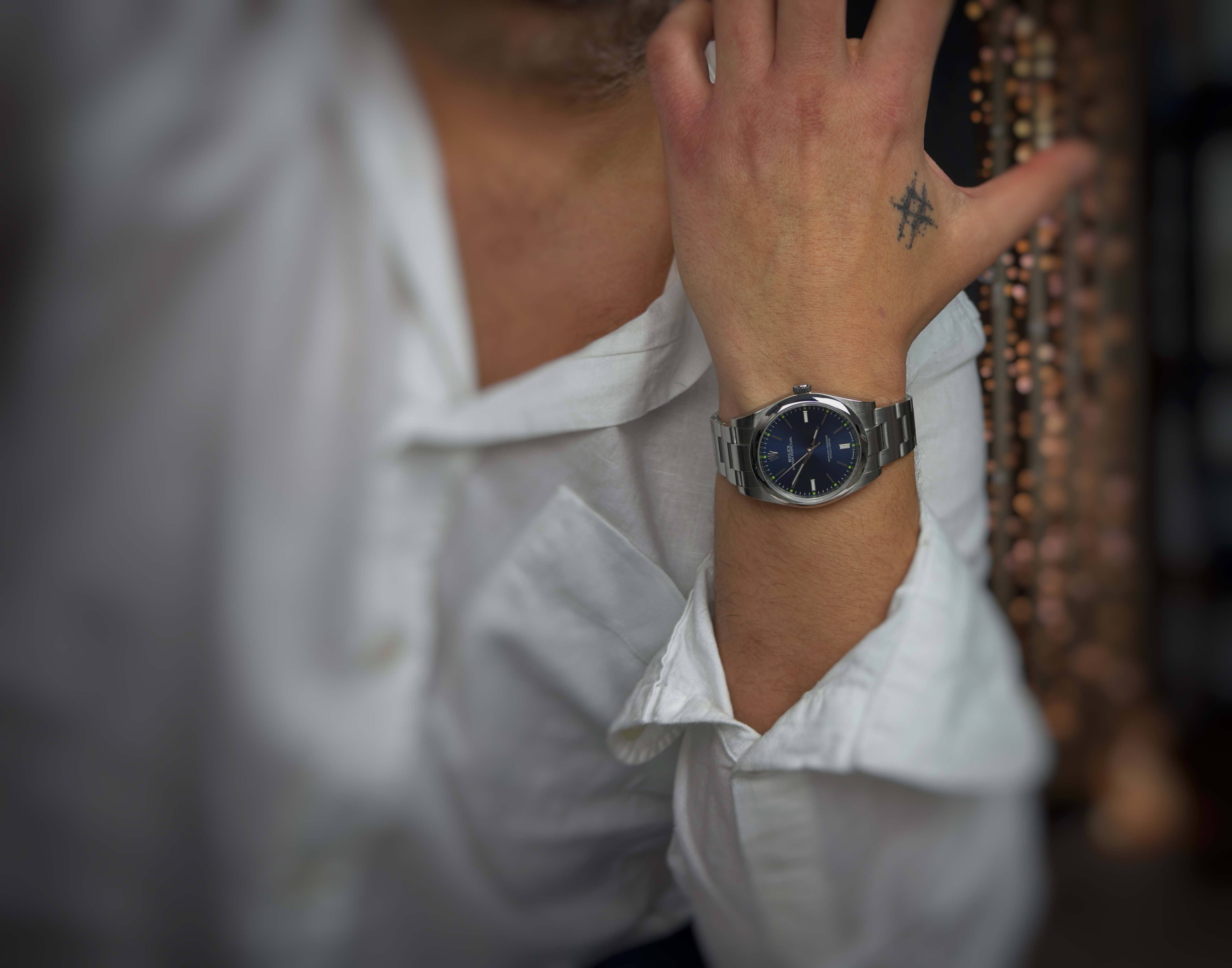 Oferowany zegarek jest oryginalny, używany, w bardzo dobrym stanie. Rolex Oyster Perpetual to esencja czystego DNA marki Rolex – ponadczasowy design, perfekcyjne proporcje i legendarna niezawodność. Wersja z niebieską tarczą wyróżnia się świeżym, nowoczesnym charakterem, zachowując jednocześnie klasyczną elegancję odpowiednią na każdą okazję. Minimalistyczna kompozycja tarczy bez datownika podkreśla harmonię projektu i doskonałą czytelność. To model niezwykle uniwersalny – idealny zarówno do codziennego noszenia, jak i do bardziej formalnych stylizacji, stanowiący jeden z najbardziej rozpoznawalnych i cenionych zegarków w ofercie Rolexa. Numer referencyjny 114300 W zestawie oferowany zegarek posiada oryginalne pudełko firmy Rolex oraz komplet dokumentów. Pierwsza sprzedaż w 2015 roku Wodoszczelność producent określił do 100 metrów.