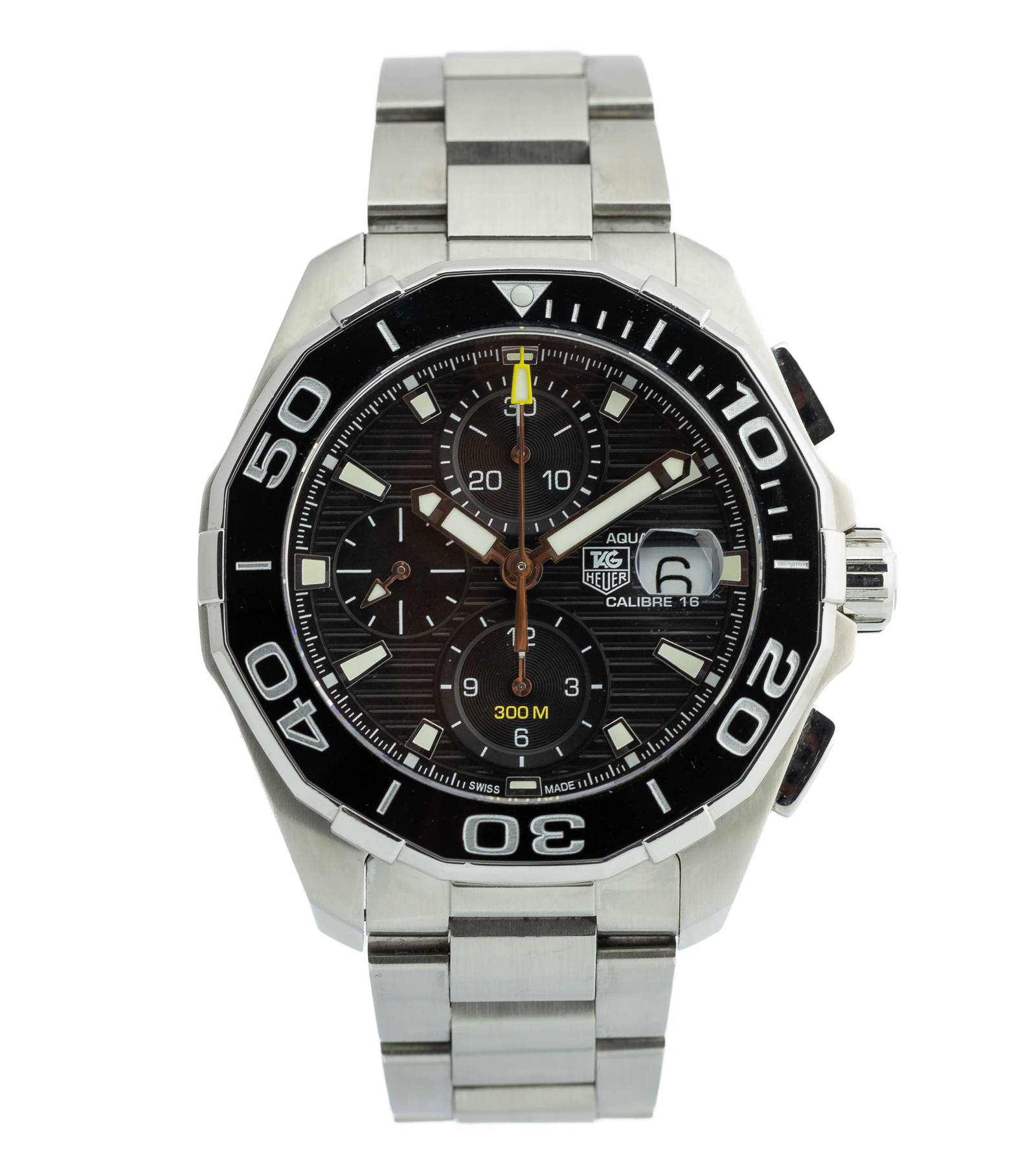 Oryginalny zegarek, używany stan bardzo dobry. Niezawodny model AQUARACER który został wykonany ze stali, posiada tarczę koloru czarnego, Na jego funkcję składa się datownik oraz chronograf. Producent określił wodoszczelność do 300 metrów. Numer referencyjny CAY211A.BA0927 Oferowany zegarek posiada oryginalne pudełko firmy TAG Heuer oraz komplet dokumentów. Pierwsza sprzedaż w ……….. roku.