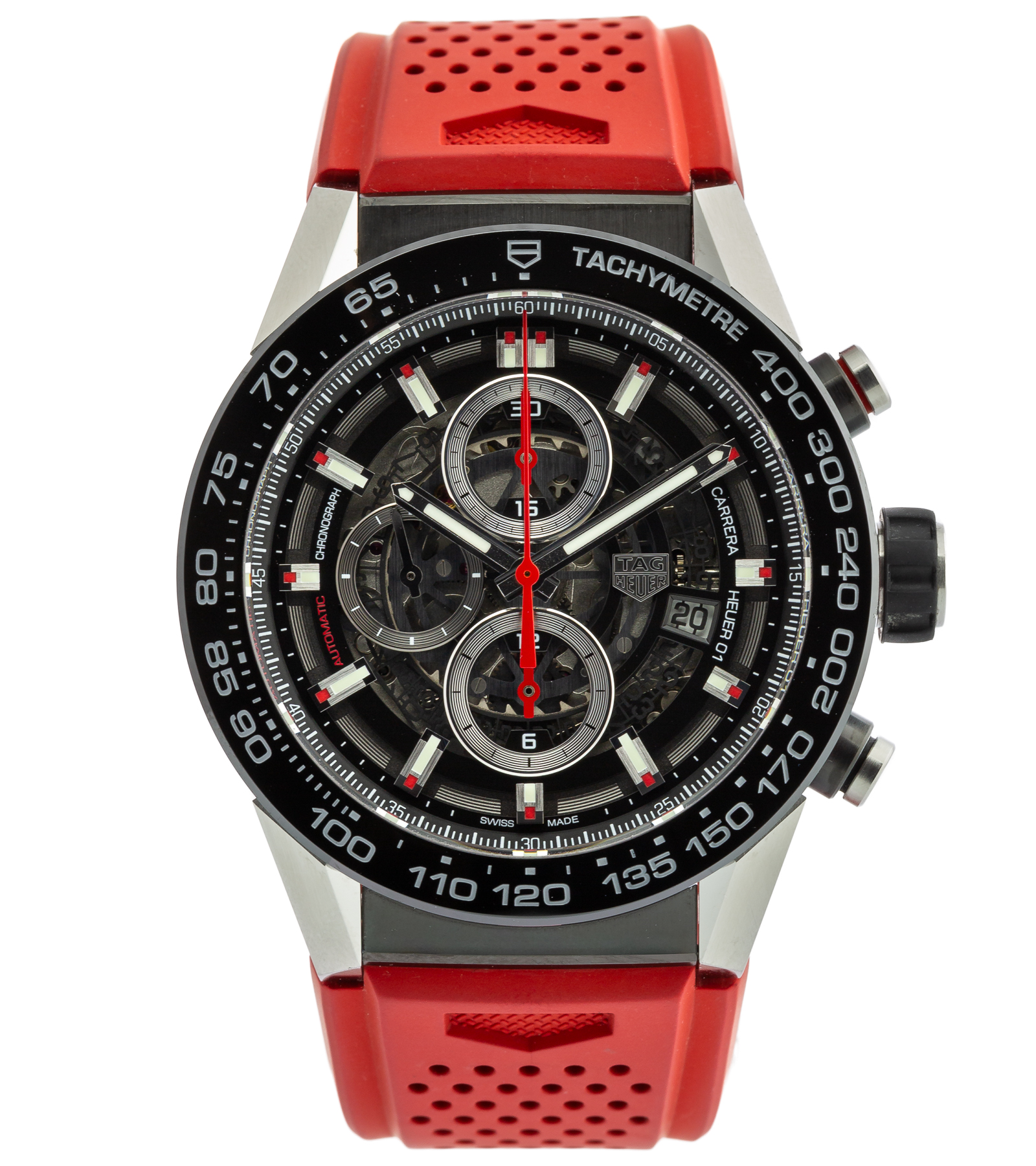 Oryginalny zegarek używany, zachowany w bardzo dobrym stanie. TAG Heuer Carrera Heuer 01 to nowoczesny, sportowy chronograf o wyrazistym, technicznym charakterze, który doskonale wpisuje się w DNA kolekcji Carrera – inspirowanej światem motorsportu. Wersja z czerwonymi akcentami oraz szkieletowaną tarczą podkreśla dynamiczny i futurystyczny styl modelu, eksponując jednocześnie pracę mechanizmu. To propozycja dla osób ceniących odważny design oraz wysoką funkcjonalność w sportowym wydaniu.