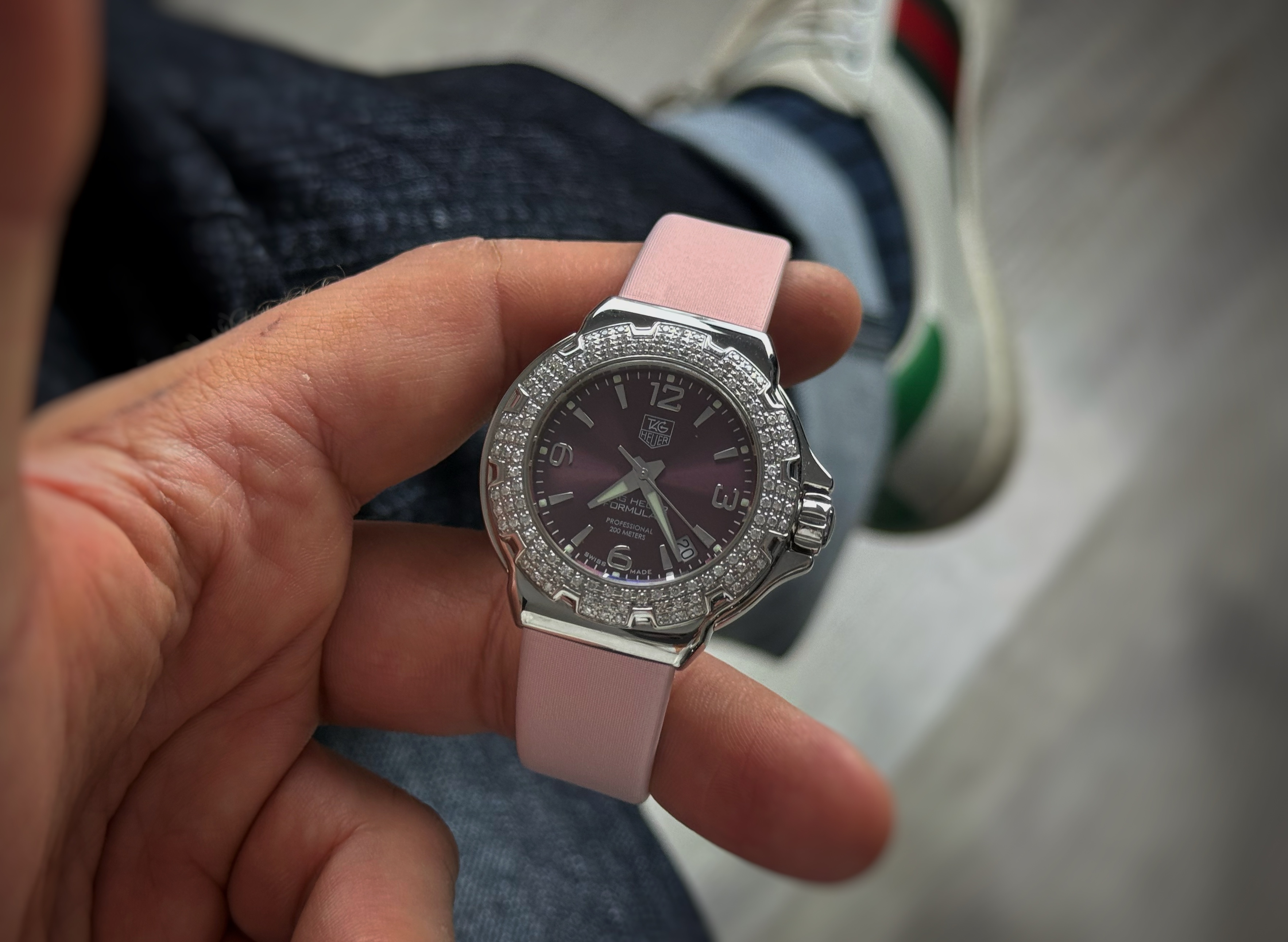 Oryginalny zegarek używany w bardzo dobrym stanie. TAG Heuer Formula 1 Lady to połączenie sportowego DNA marki z kobiecą elegancją i luksusowym wykończeniem. Charakterystyczna fioletowa tarcza w zestawieniu z diamentową lunetą tworzy wyjątkowo efektowną kompozycję, idealną zarówno na co dzień, jak i na specjalne okazje. Model ten doskonale sprawdzi się jako stylowy dodatek dla kobiet ceniących prestiż, niezawodność i nowoczesny design.