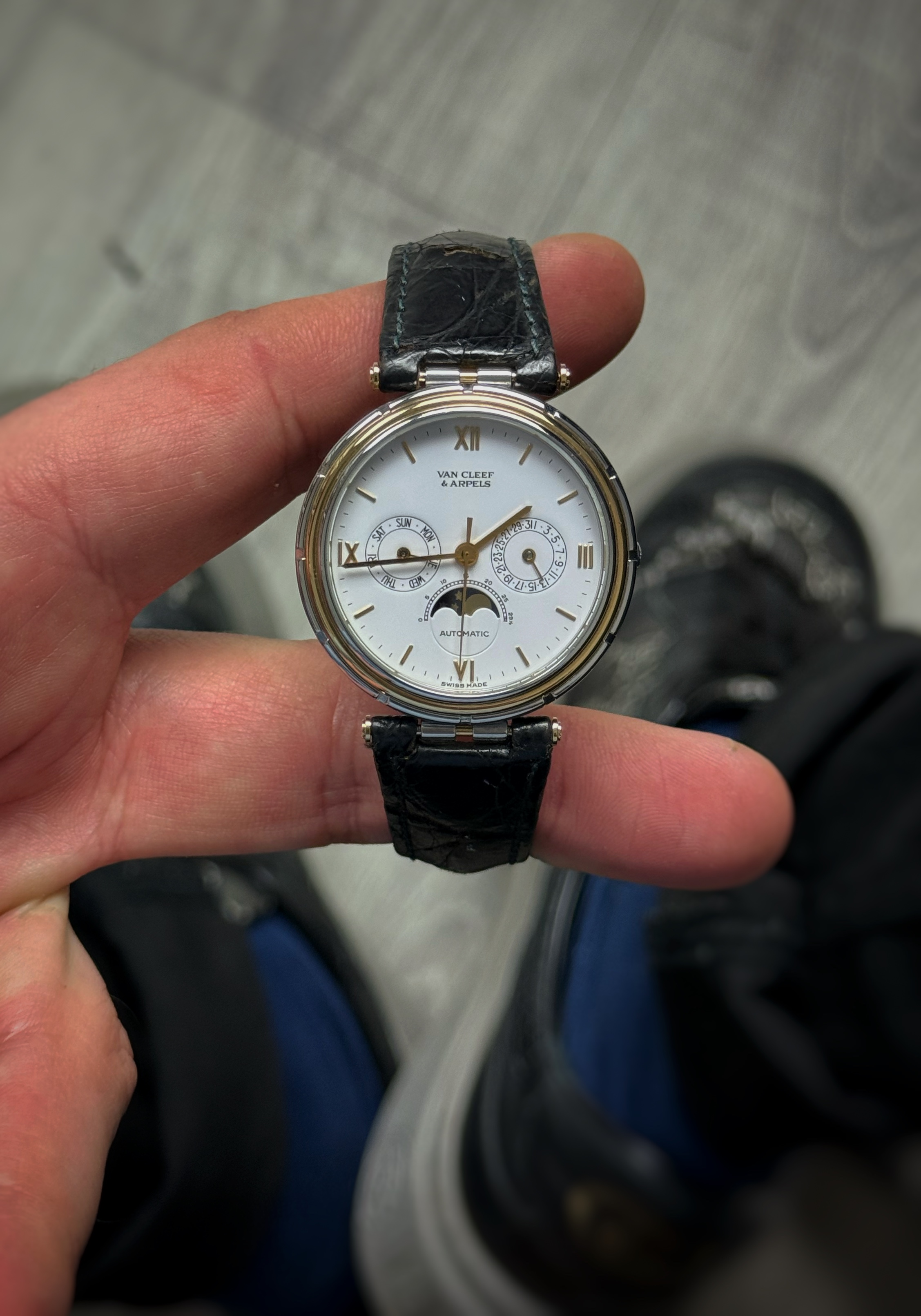 Używany oryginalny zegarek czołowego producenta Van Cleef & Arpels Bardzo nietypowy model z funkcją rocznego kalendarza oraz widocznych faz księżyca. Wodoszczelność określona przez producenta 30 metrów. Pierwsza sprzedaż około 1988 rok.