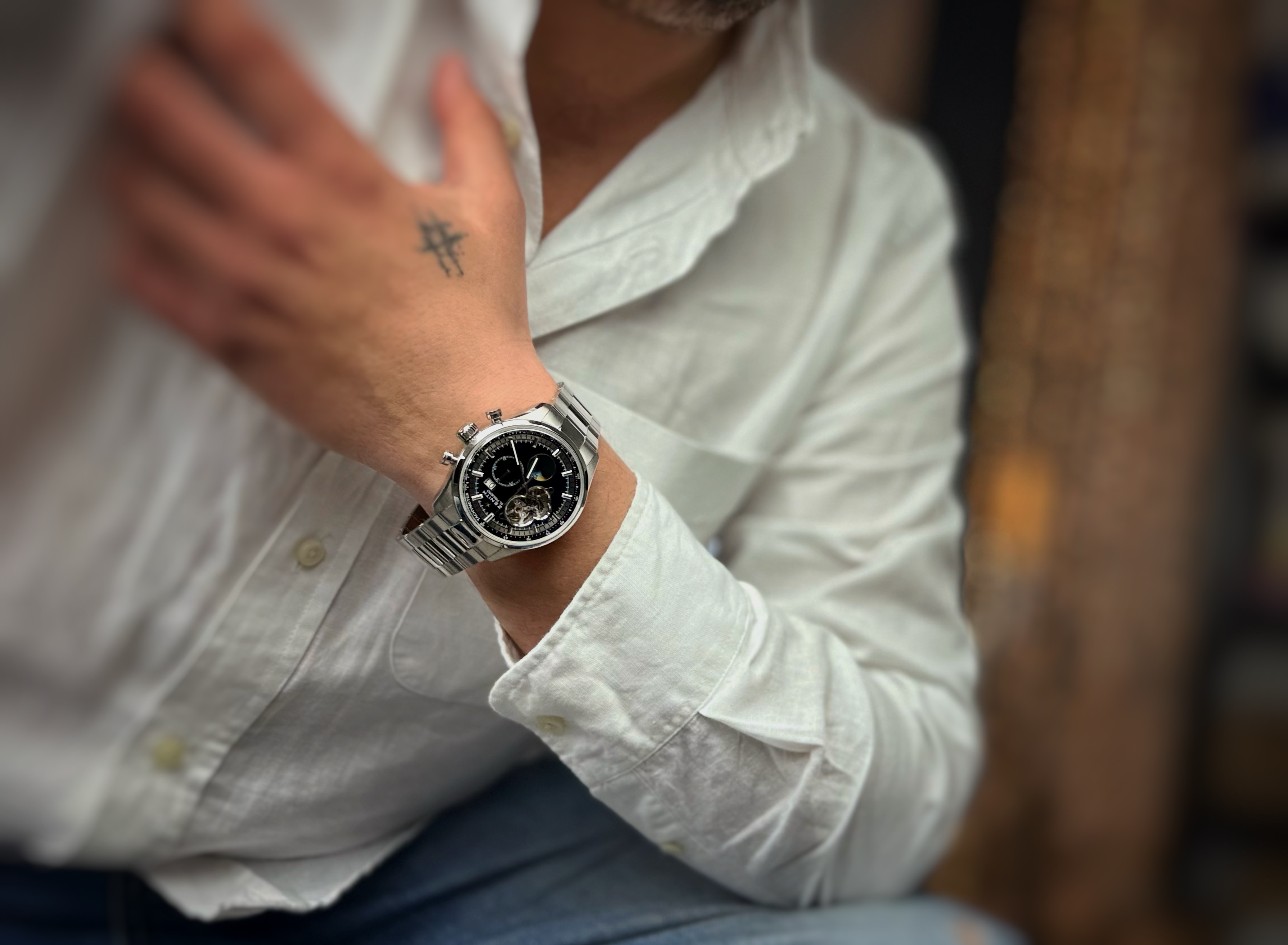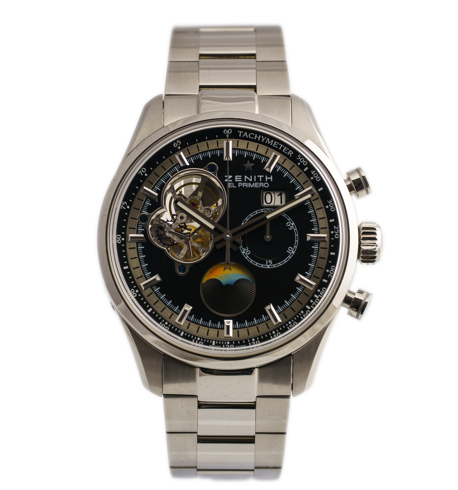 Oryginalny zegarek używany, stan bardzo dobry! Marka Zenith należy do luksusowej grupy, która wyróżnia się stylem i charakterem. Zegarek o niepowtarzalnym wyglądzie, wykonany jest ze stali, czarna tarcza na której widzimy bardzo dużo rozwiązań mechanicznych, między innymi otwarte serce. Na jego komplikacje składa się chronograf oraz fazy księżyca.
