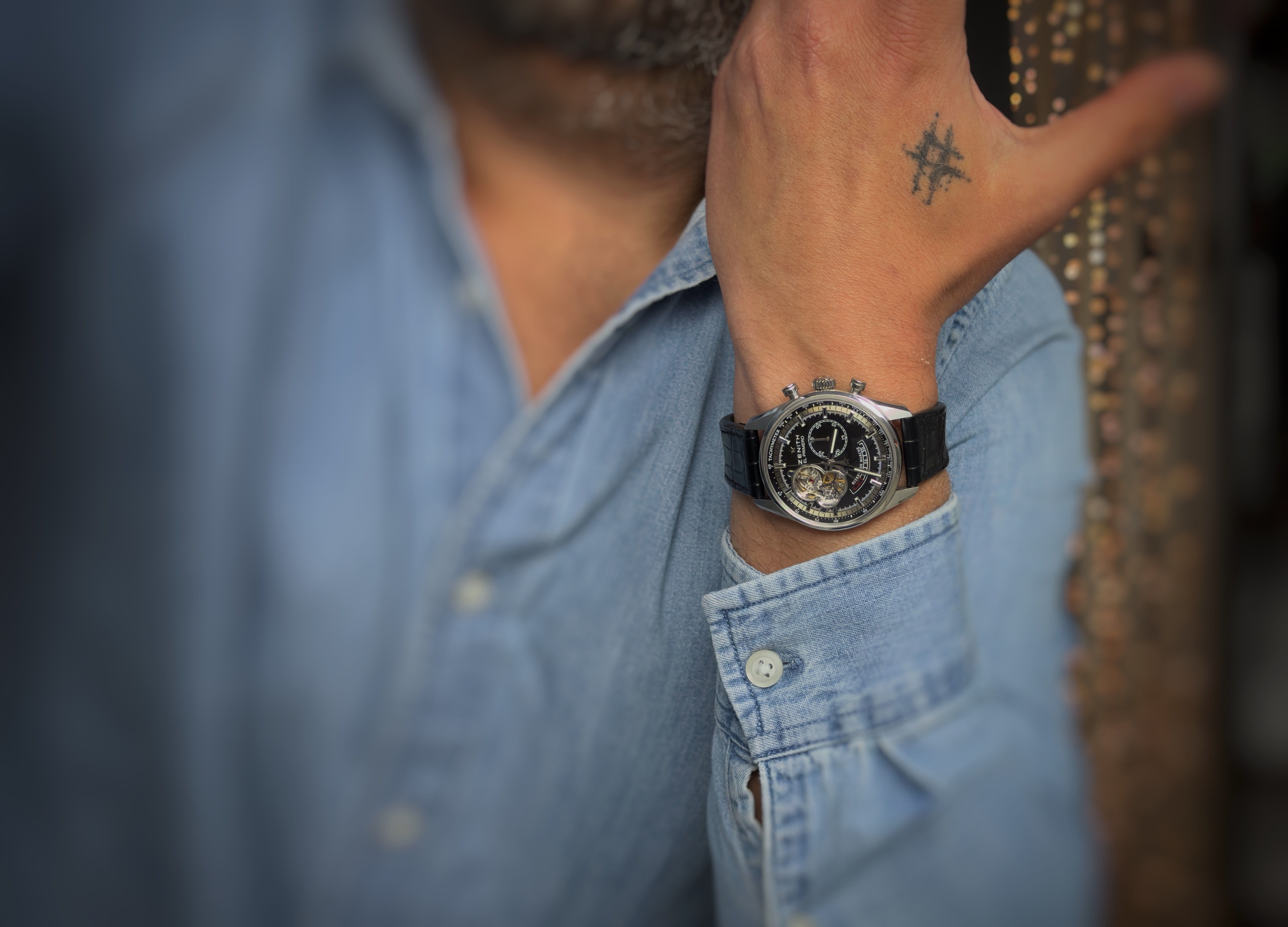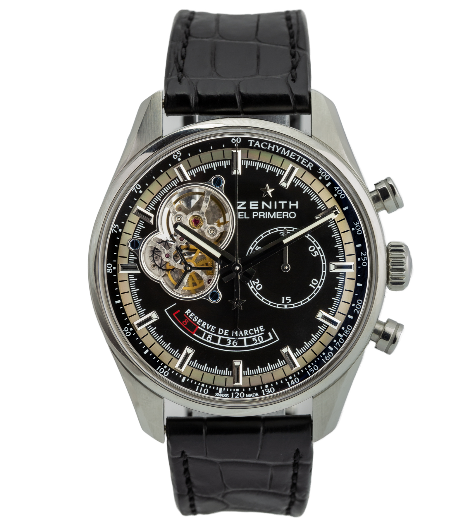 Oryginalny zegarek używany, stan bardzo dobry! Marka Zenith należy do luksusowej grupy, która wyróżnia się stylem i charakterem. Zegarek o niepowtarzalnym wyglądzie, wykonany jest ze stali, czarna tarcza na której widzimy bardzo dużo rozwiązań mechanicznych, między innymi otwarte serce. Na jego funkcję składa się chronograf oraz wskazanie rezerwy chodu.
