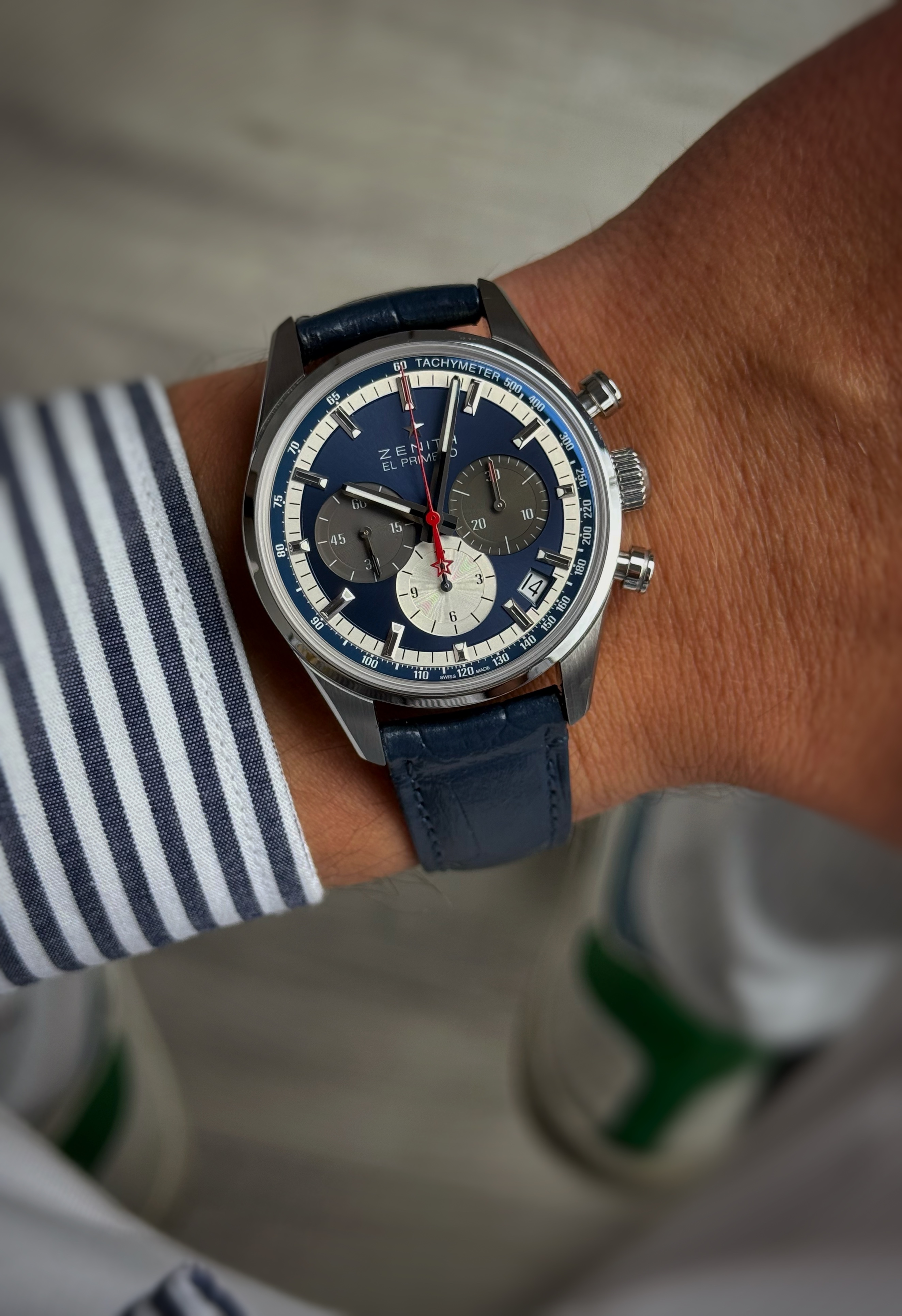 Oryginalny zegarek używany, stan niemal jak nowy (posiada folie na zapięciu) Marka Zenith należy do luksusowej grupy, która wyróżnia się stylem i charakterem. Zegarek o niepowtarzalnym wyglądzie, wykonany jest ze stali, niebieska tarcza, na której widzimy bardzo dużo rozwiązań mechanicznych. Na jego komplikacje składa się chronograf oraz datownik.